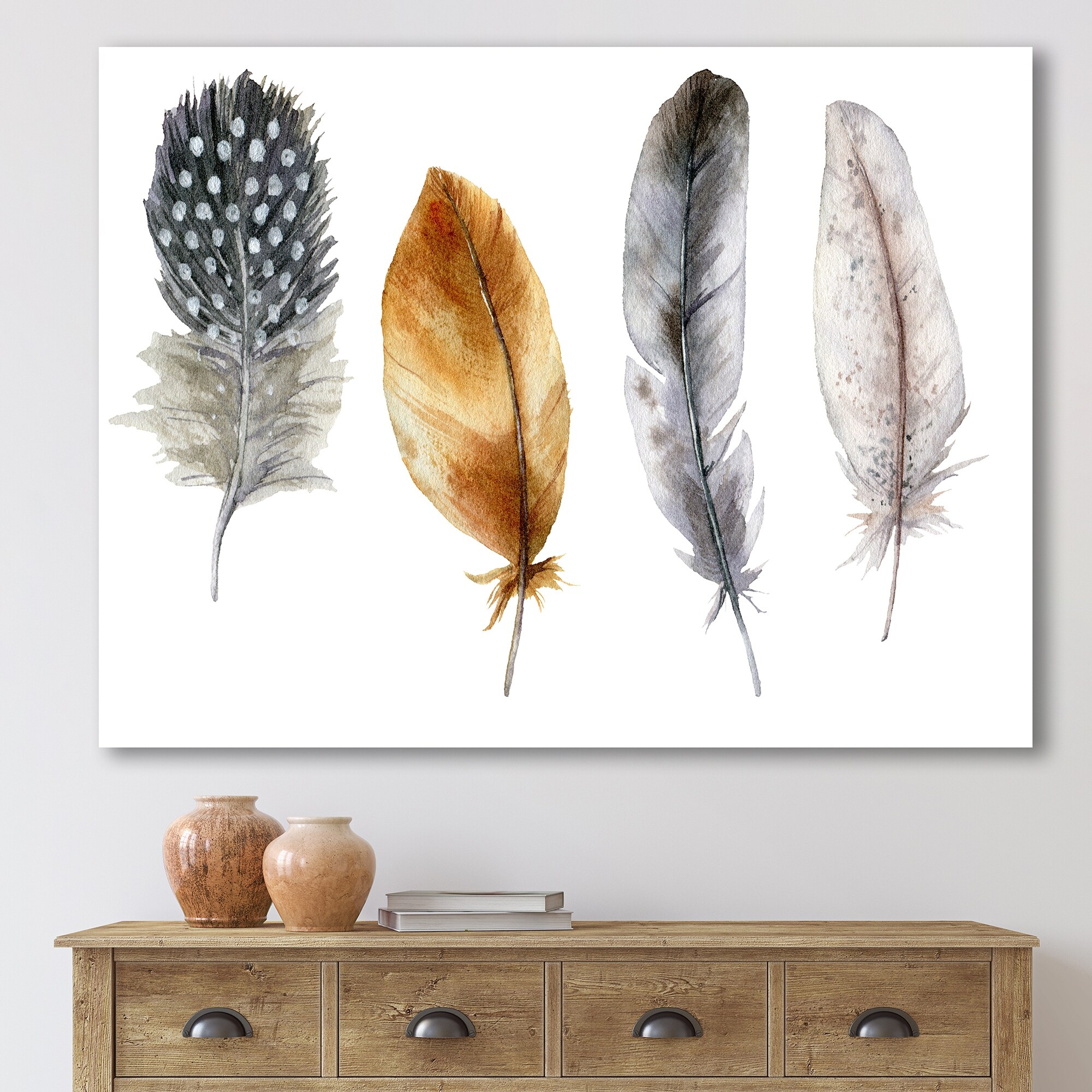 Designart "Boho Feather in Orange & Blue Striped & Polka Dost" Bohemian & Eclectic Canvas Wall Art Print