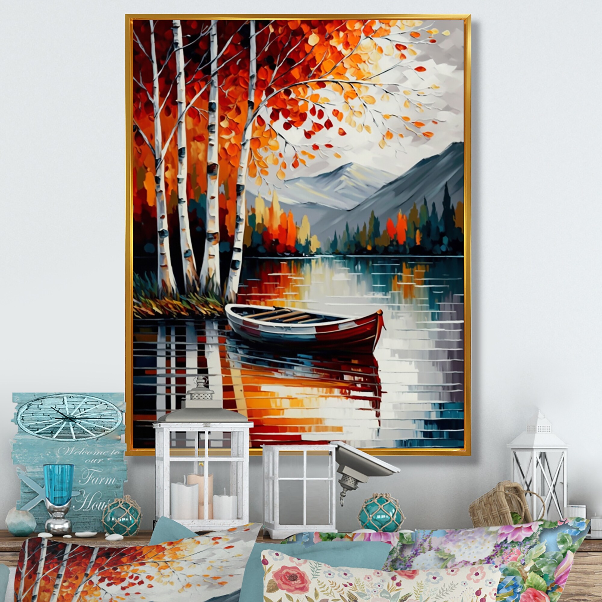 Designart "Red And Orange Birch Trees By the Lake X" Landscape Framed Canvas Art Print