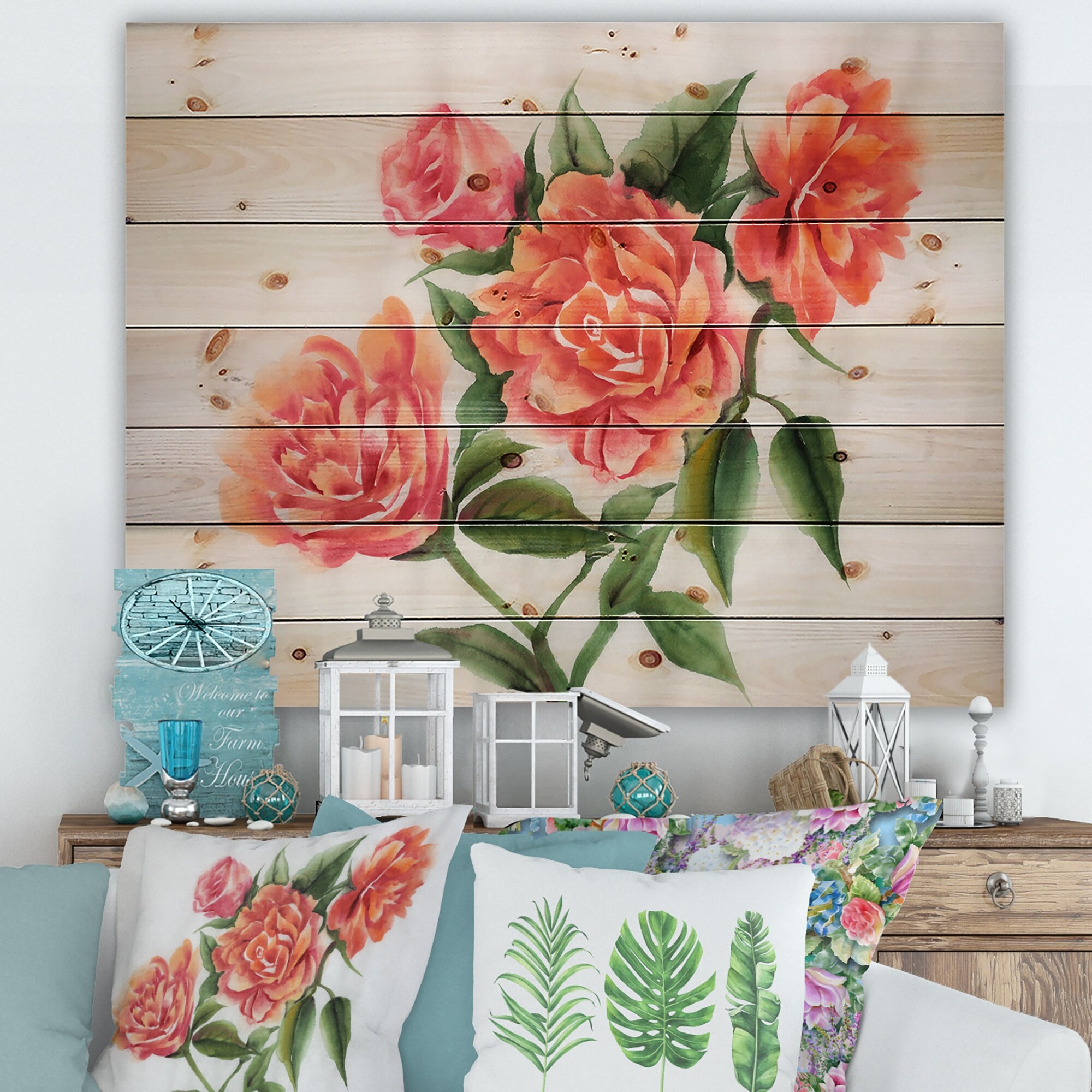 Designart 'Orange VIntage Roses' Traditional Print on Natural Pine Wood