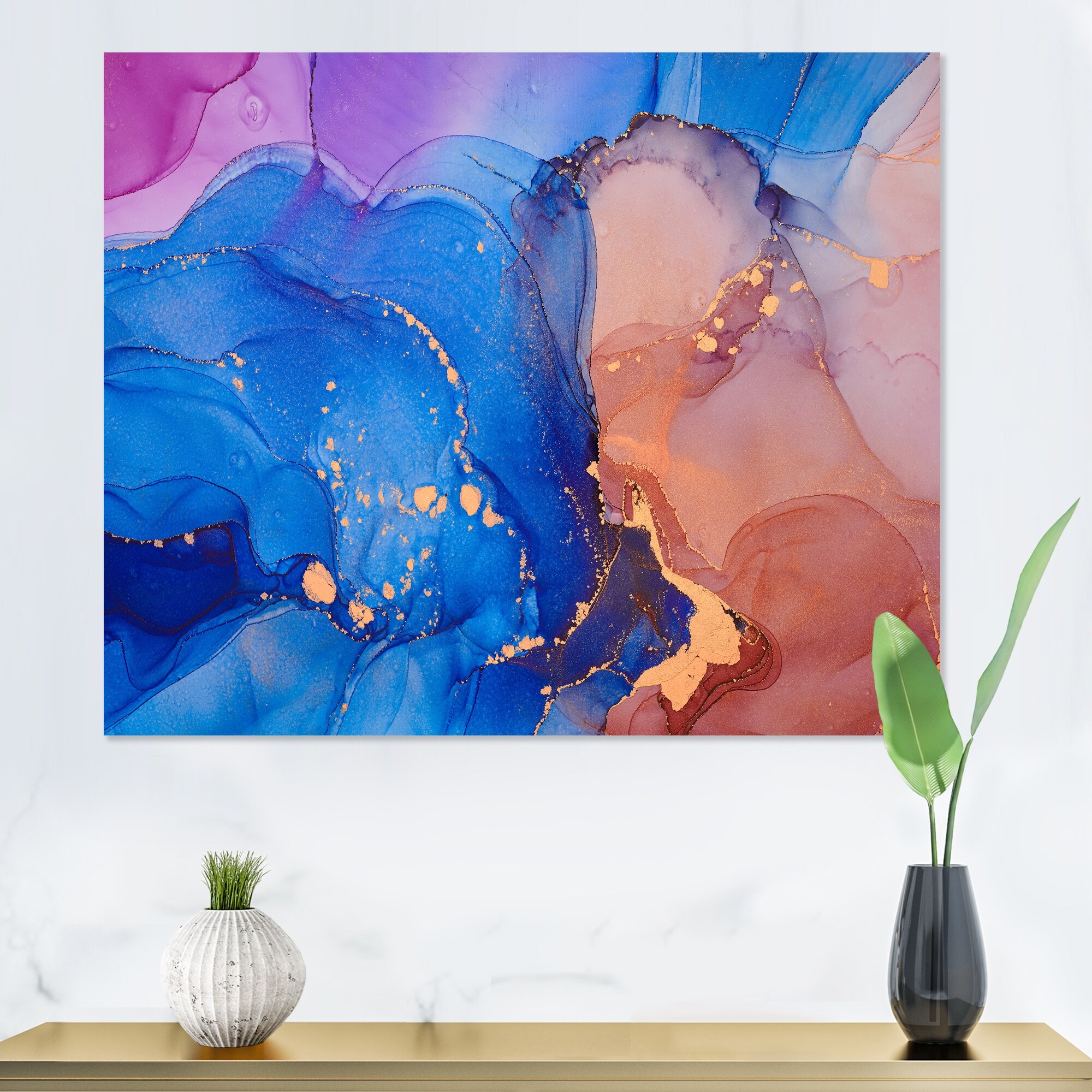 Designart "Orange Blue Transcendent Liquid Ink II" Abstract Marble Metal Wall Art