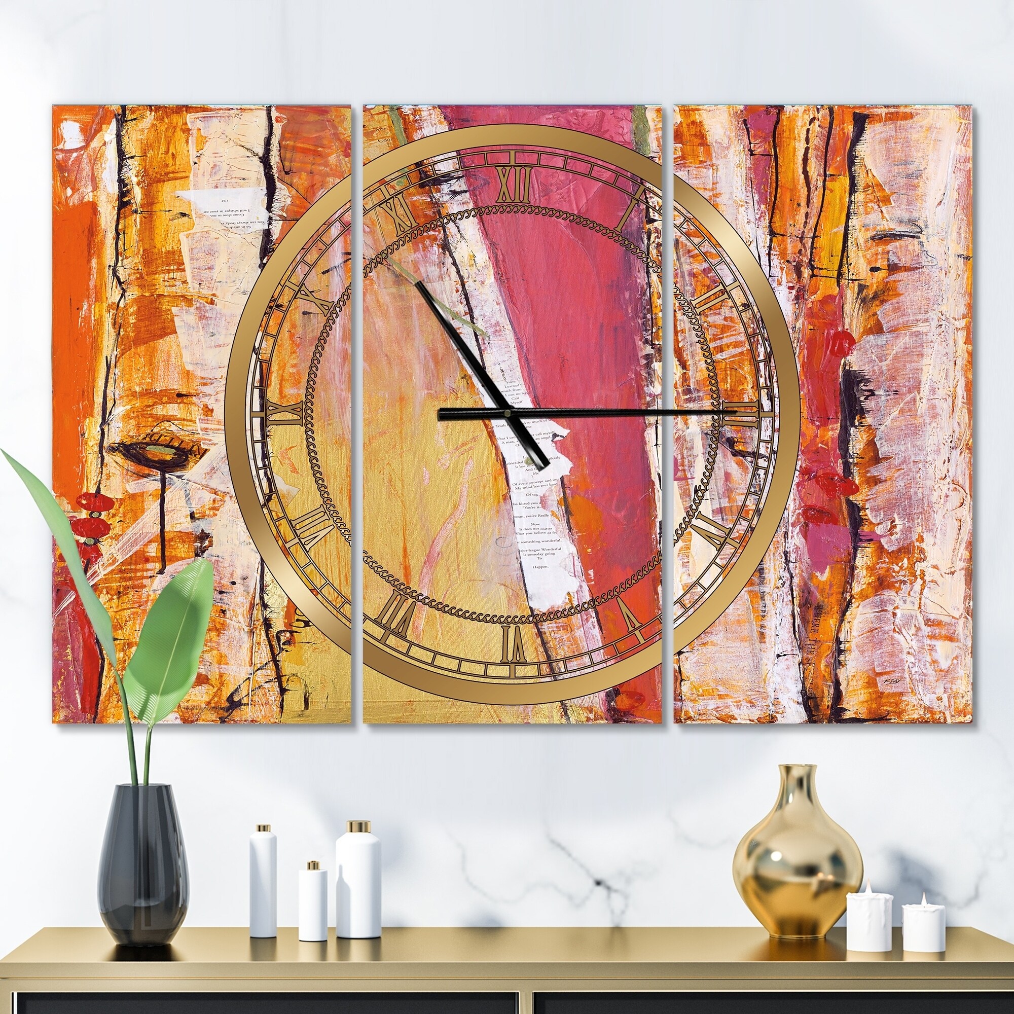 Designart 'Orange Glam Natural Wood' Glam 3 Panels Oversized Wall CLock - 36 in. wide x 28 in. high - 3 panels