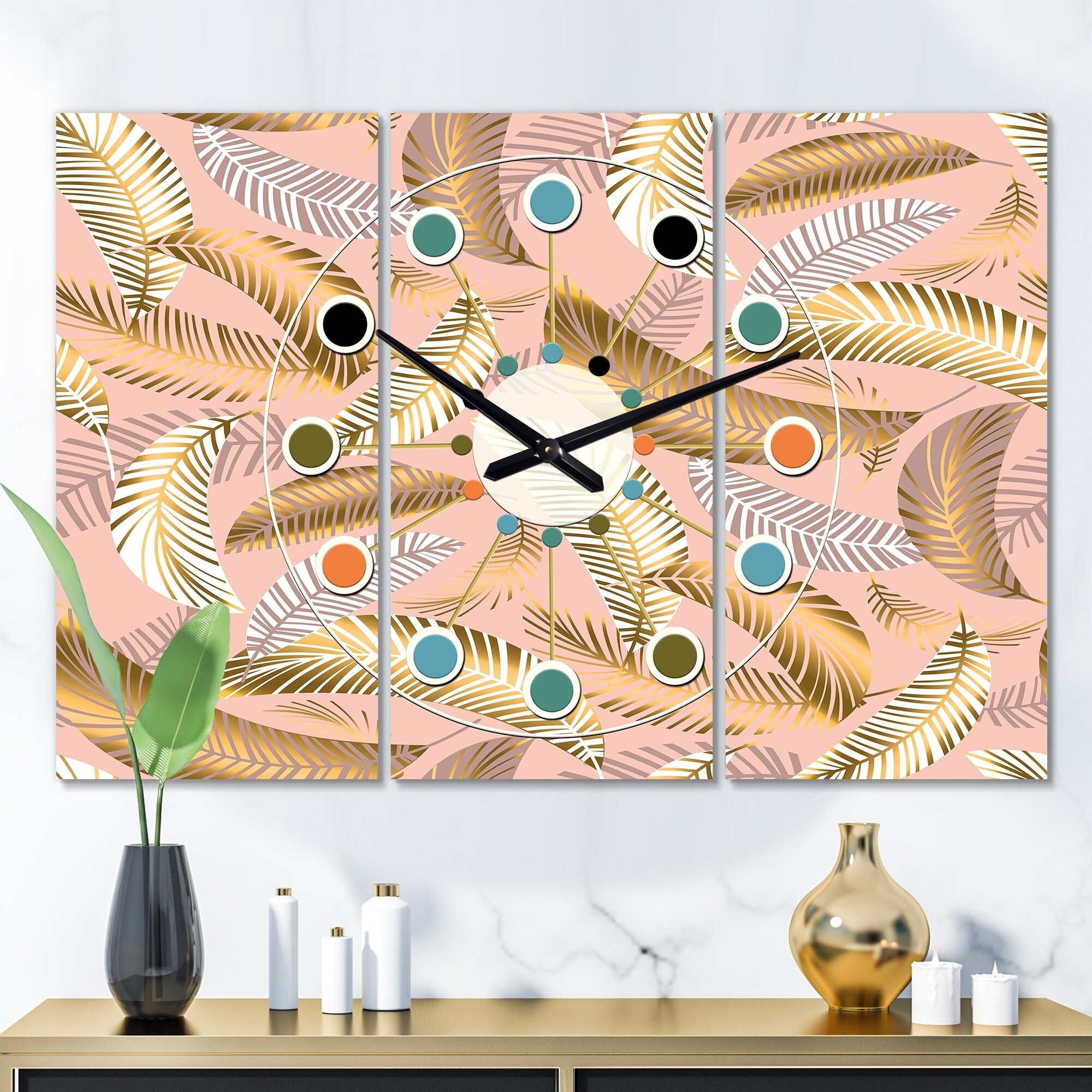 Designart 'Golden Tropical Pattern V' Oversized Mid-Century wall clock - 3 Panels - 36 in. wide x 28 in. high - 3 Panels