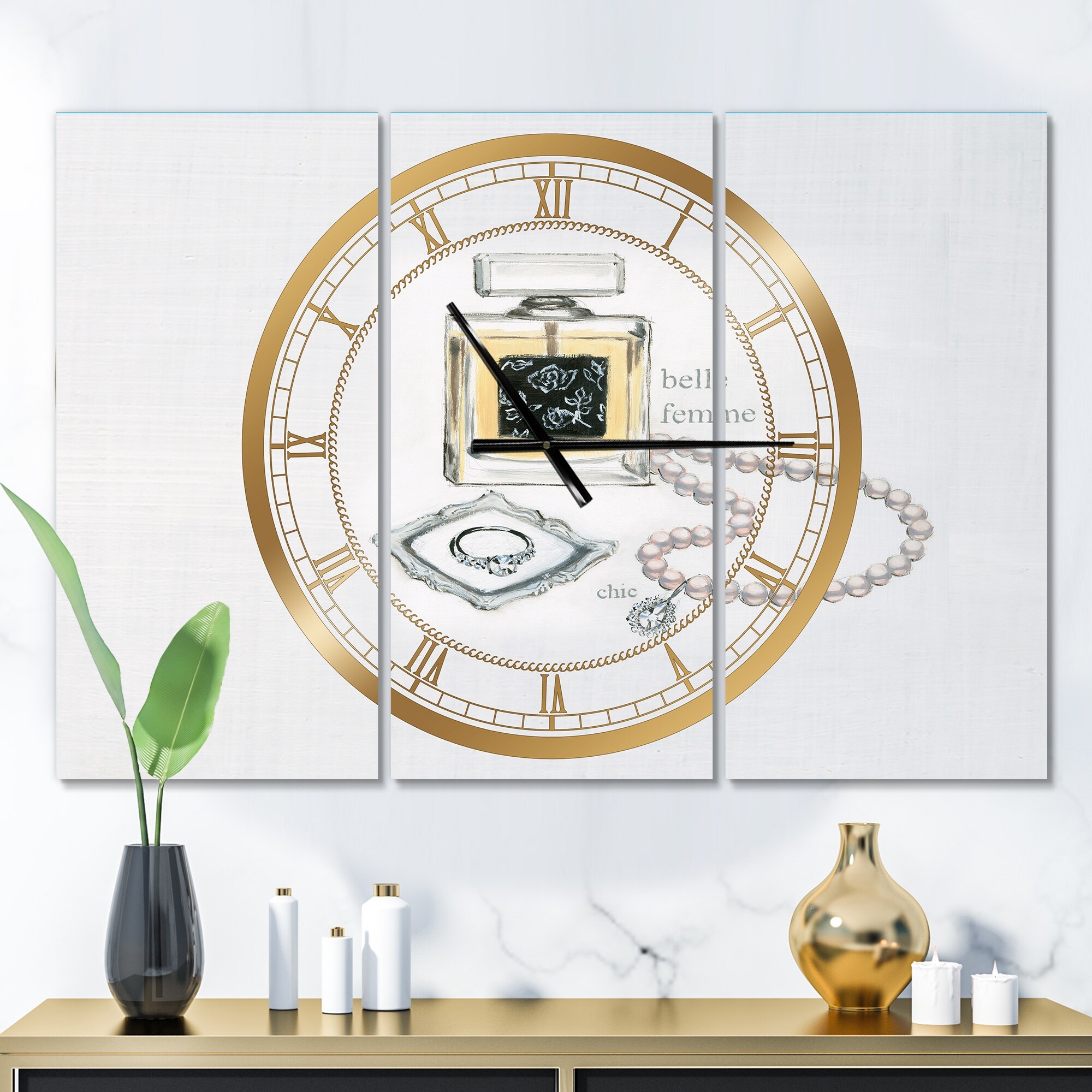 Designart 'Perfume Glam Bathroom I' Glam 3 Panels Oversized Wall CLock - 36 in. wide x 28 in. high - 3 panels