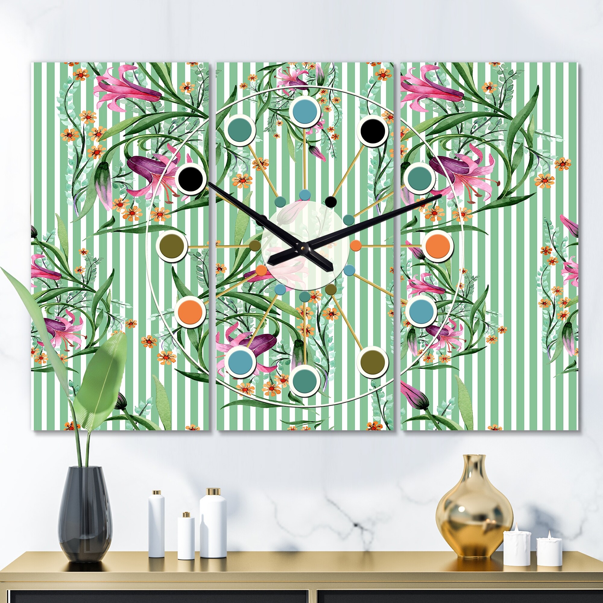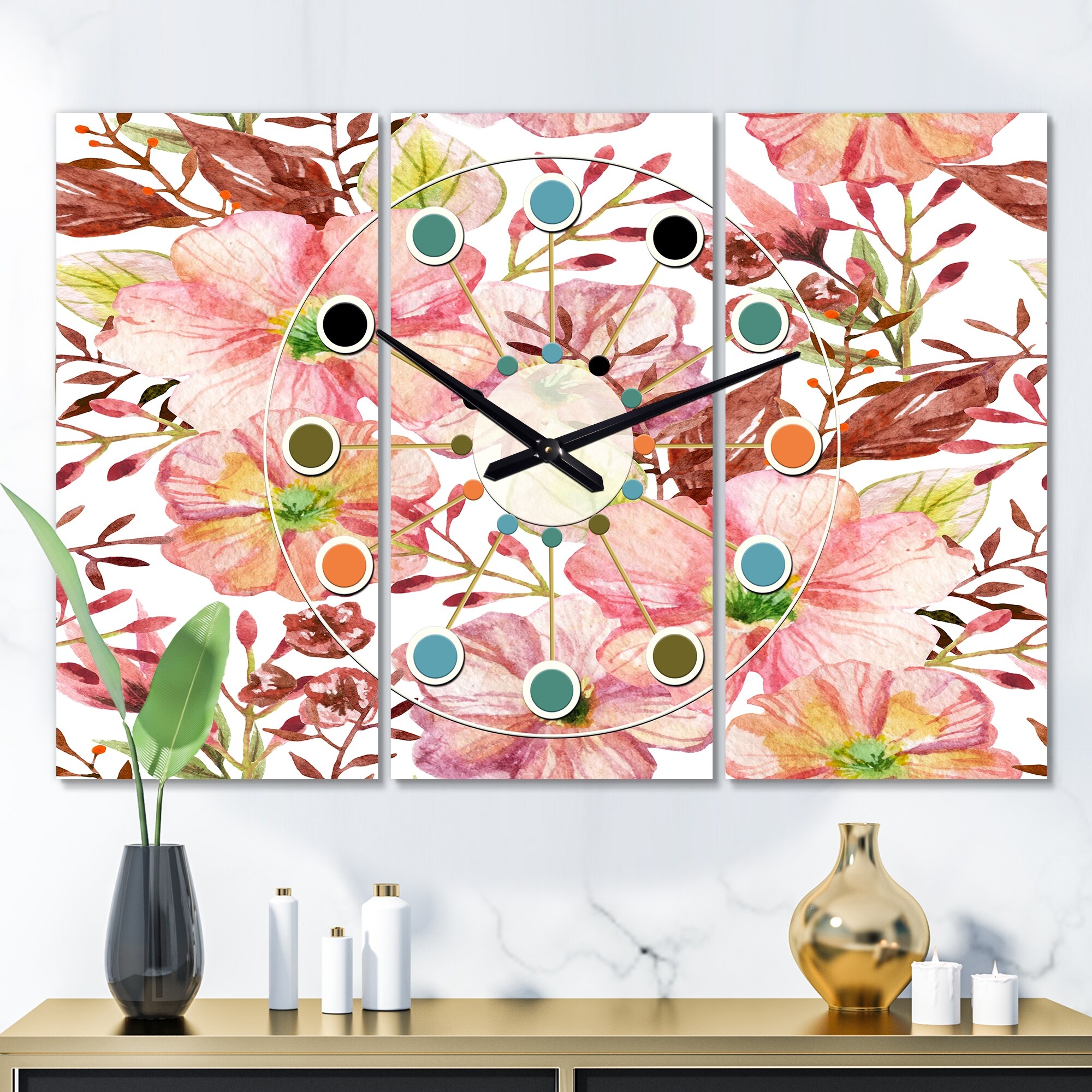 Designart 'Floral Botanical Retro II' Oversized Mid-Century wall clock - 3 Panels - 36 in. wide x 28 in. high - 3 Panels