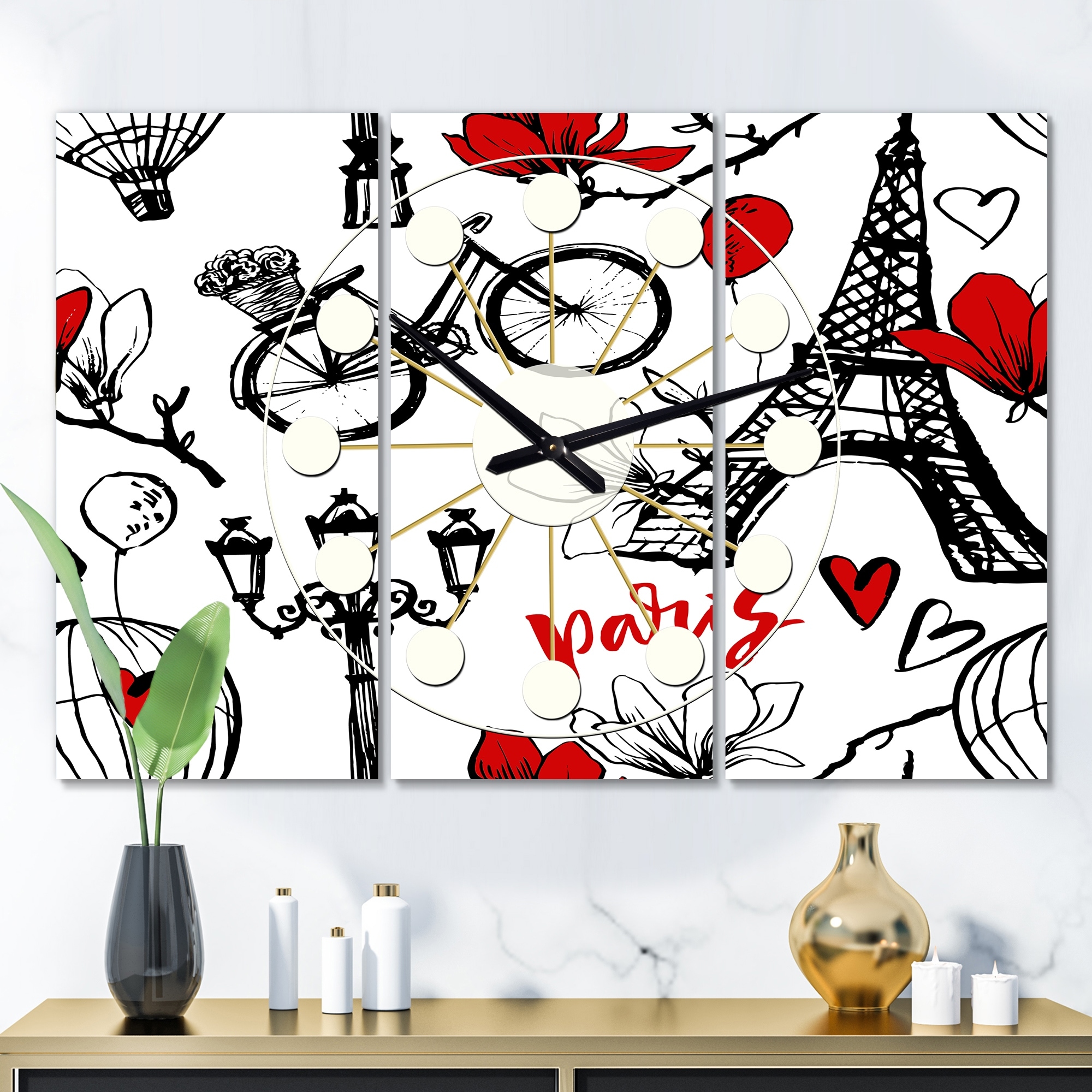 Designart 'Paris Eiffel Red Hearts I' Oversized Mid-Century wall clock - 3 Panels - 36 in. wide x 28 in. high - 3 Panels