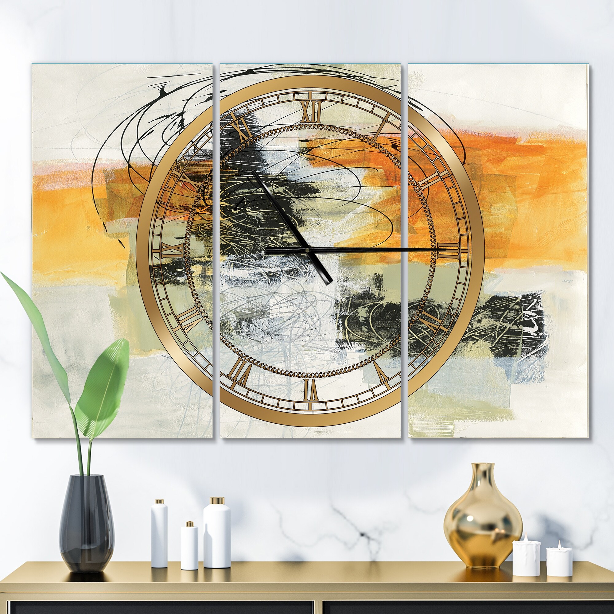 Designart 'Glam Black and Yellow I' Glam 3 Panels Oversized Wall CLock - 36 in. wide x 28 in. high - 3 panels