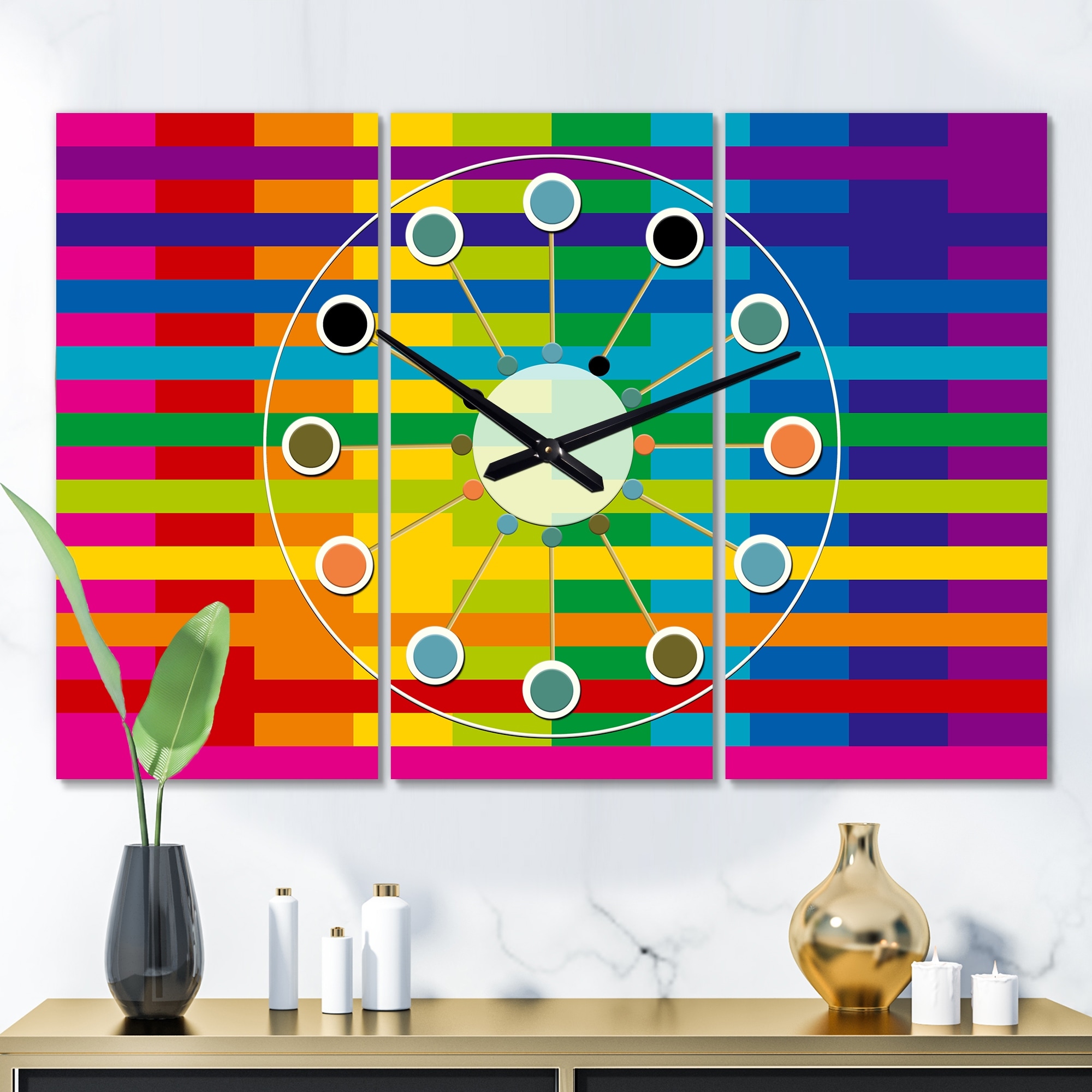 Designart 'Rainbow colors simple geometric pattern.' Oversized Mid-Century wall clock - 3 Panels