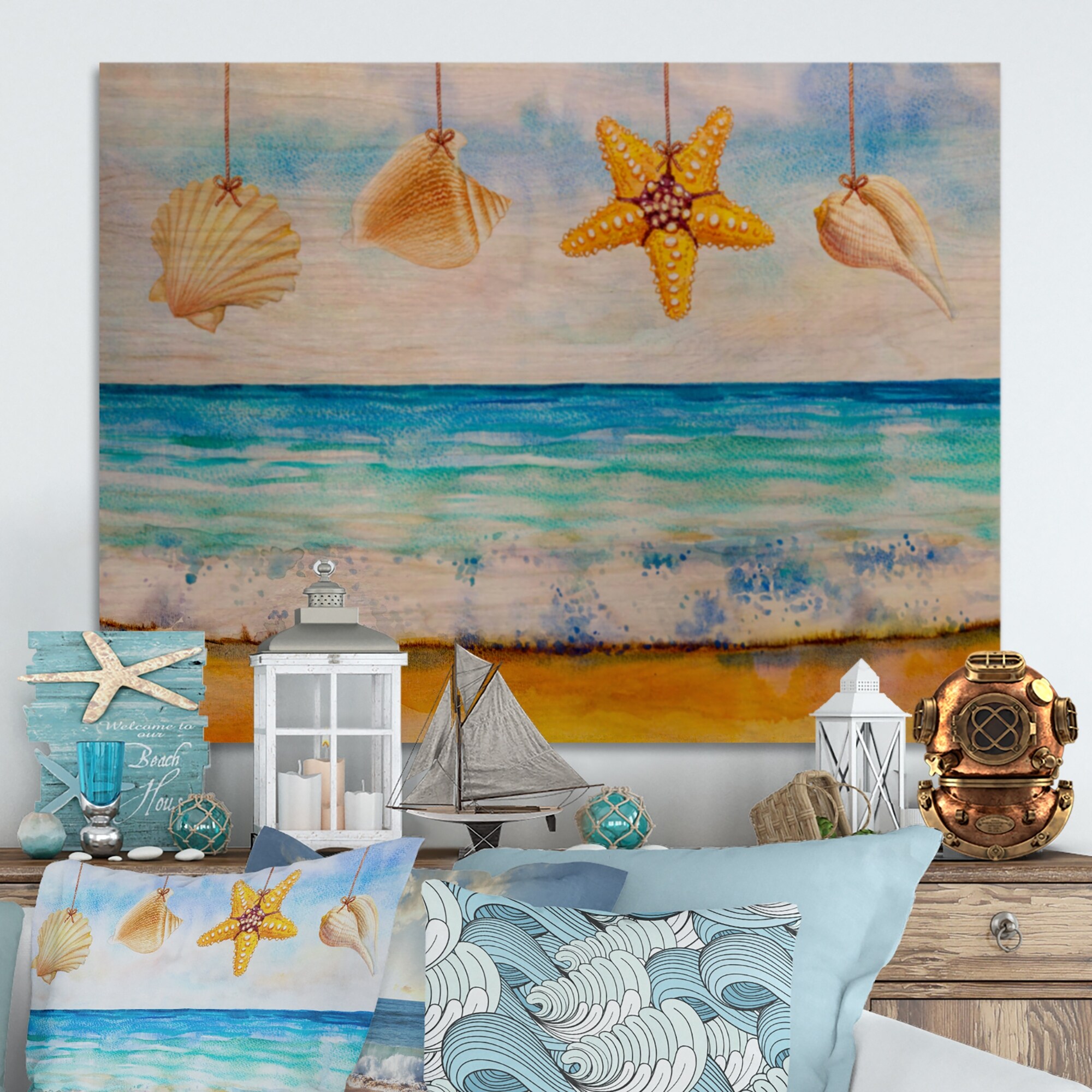 Designart 'Colorful Painting of Coastal Seashell' Nautical & Coastal Wood Wall Art - Natural Pine Wood