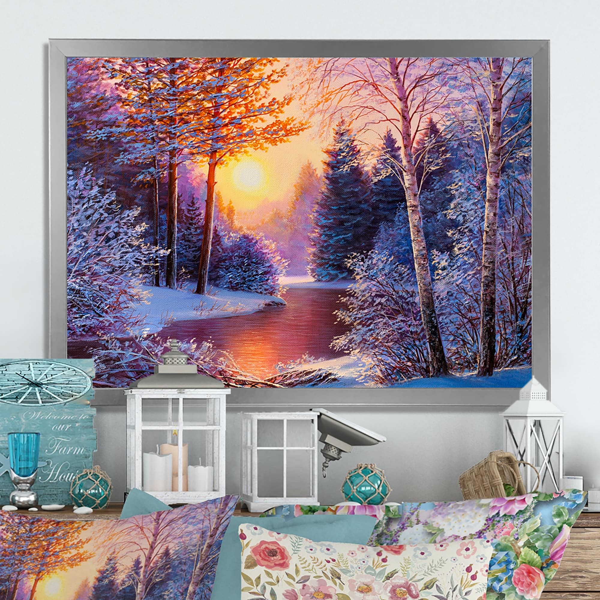 Designart "Sunset On Winter River Painting II" Traditional Framed Wall Art