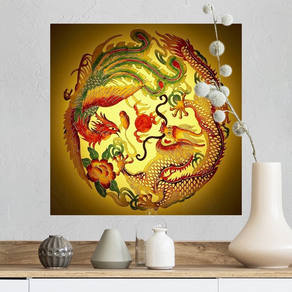 "Dragon and phoenix stencil on yellow background" Poster Print - Multi