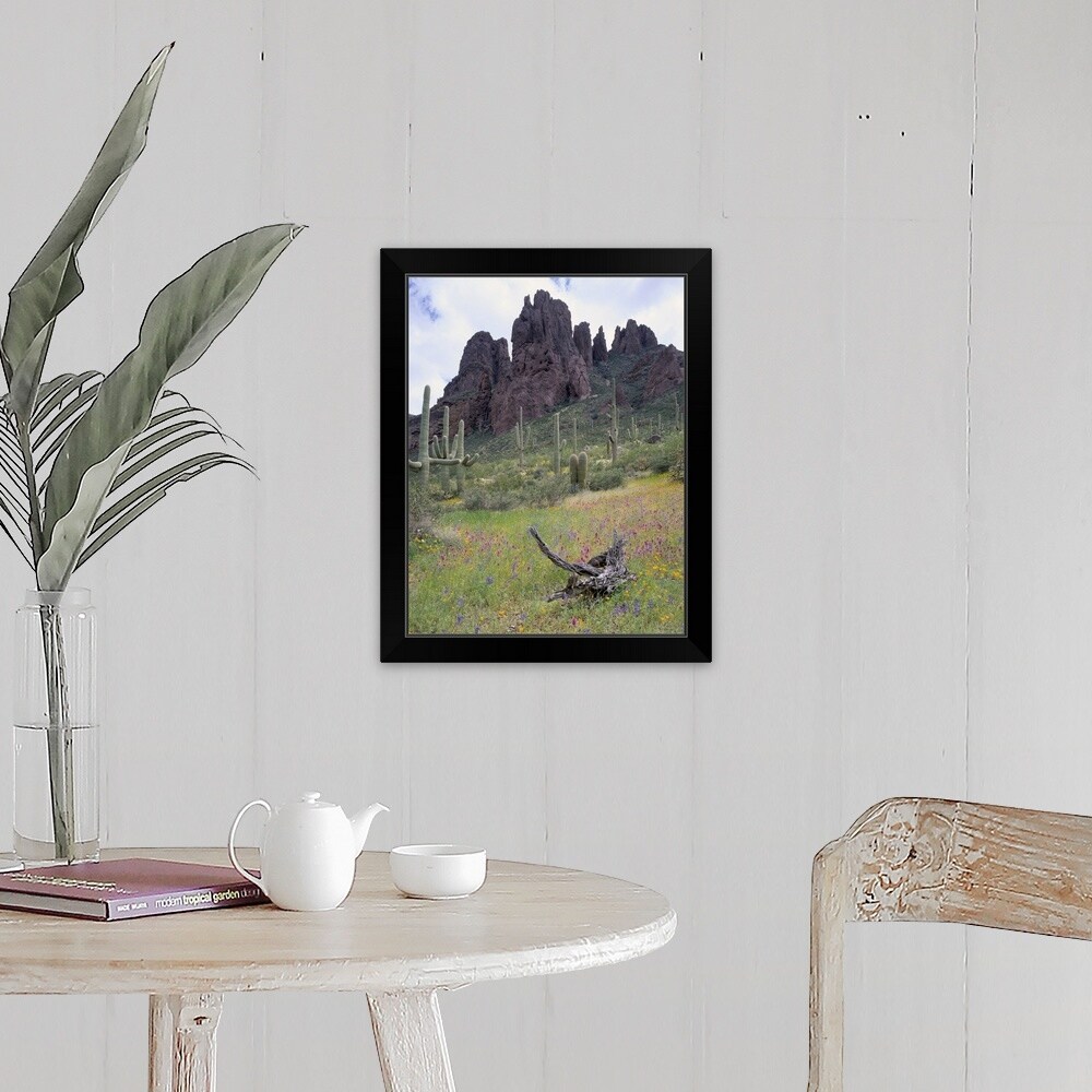 "Arizona, Organ Pipe Cactus National Monument, Cactus and wildflowers in a landscape" Black Framed Print
