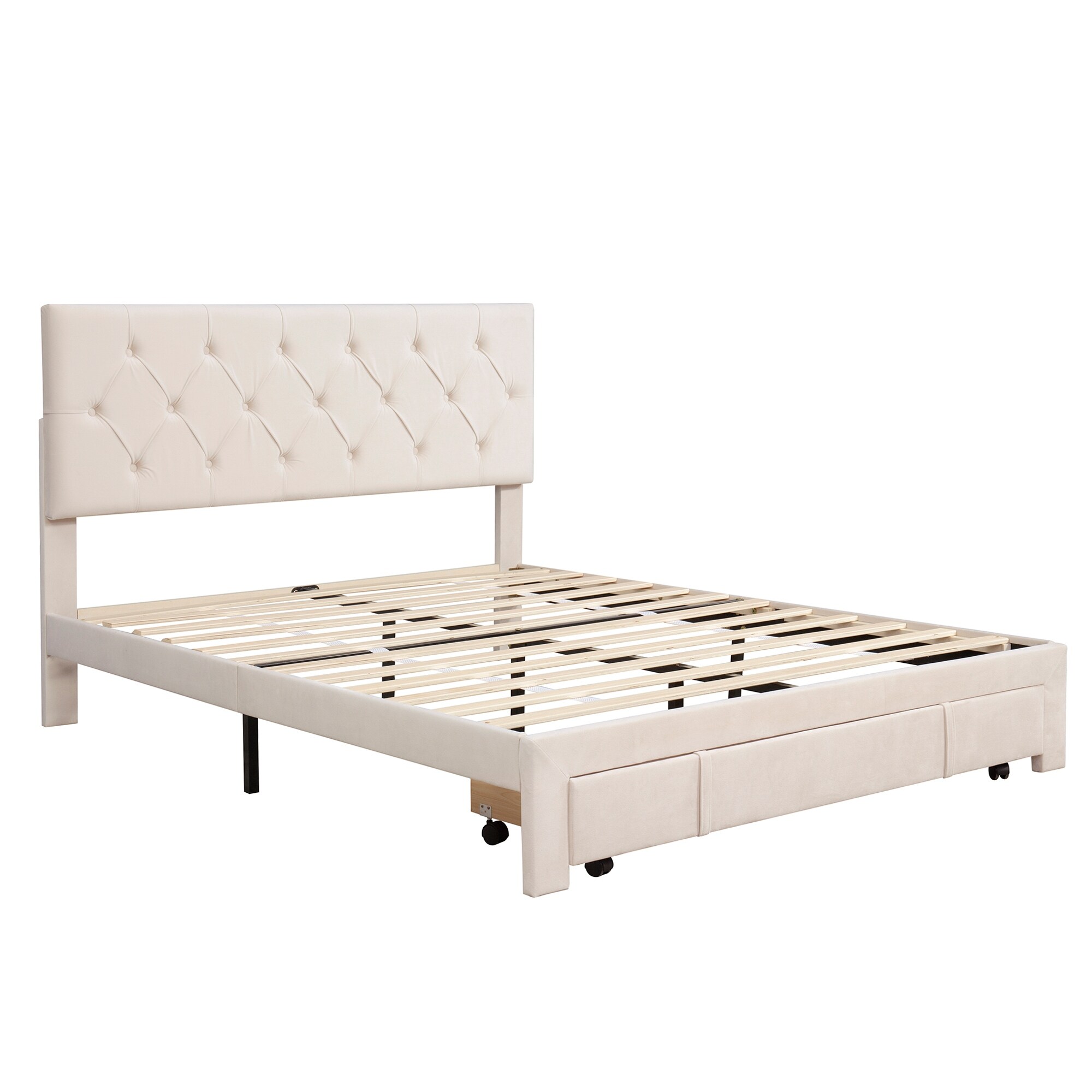 Modern Queen Size Velvet Upholstered Platform Bed with Tufted Headboard and Drawers