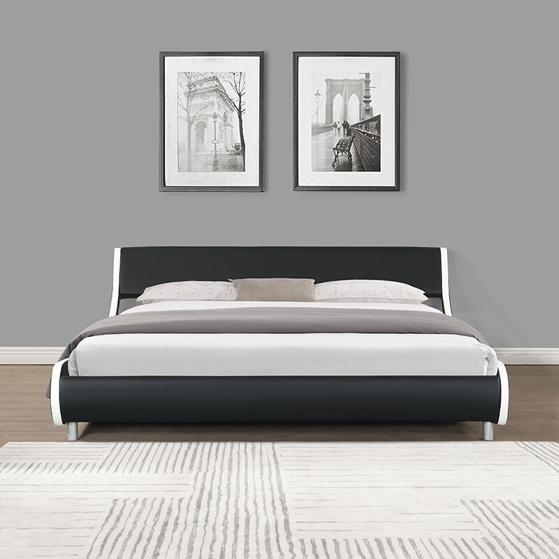Faux Leather Upholstered Platform Bed Frame with Curve Design Headboard, Queen Size, Black&White