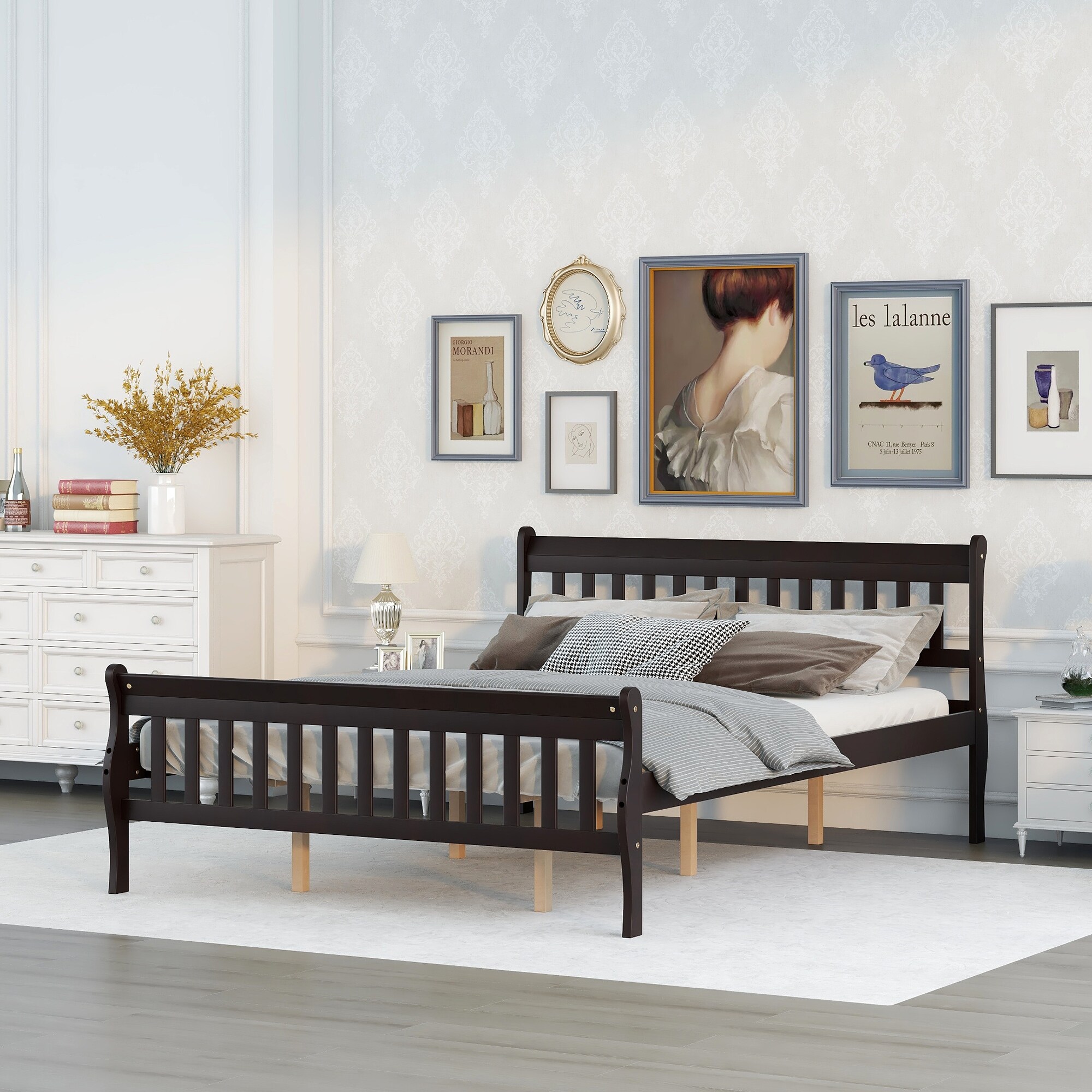 Queen Size Wood Platform Bed Frame Sleigh Bed with Panel Design Headboard Footboard&Wood Slat Support for Guest Living Room