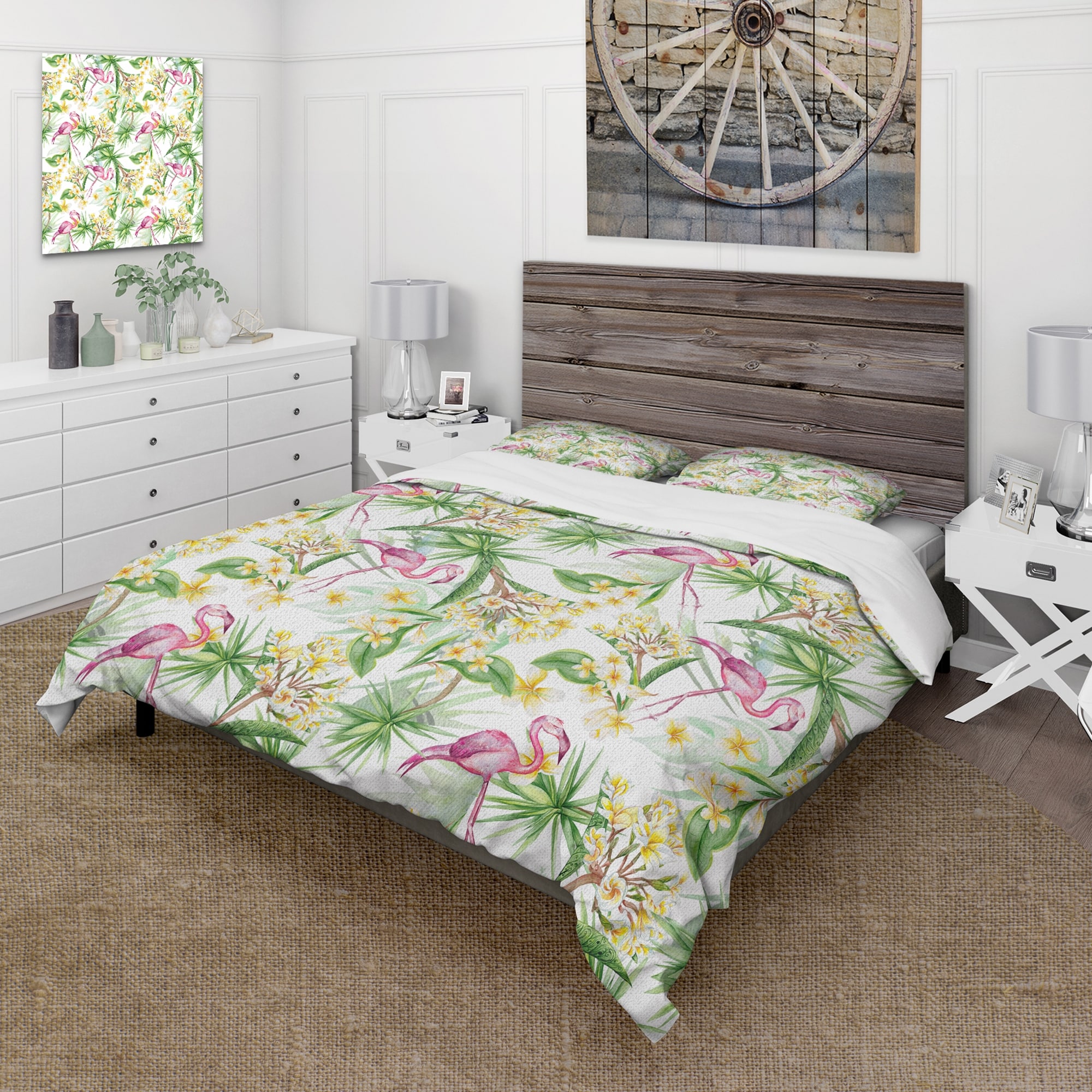 Designart 'Tropical Foliage, Yellow Flowers With Flamingo IV' Modern Duvet Cover Comforter Set