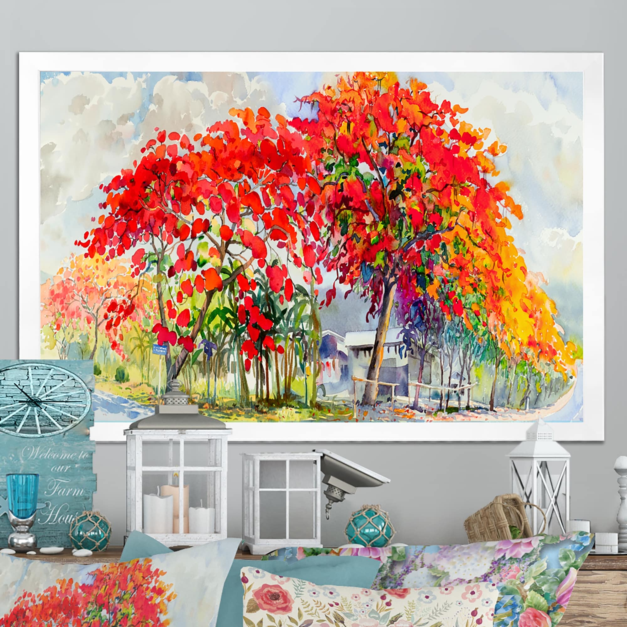 Designart "Colorfull Blooming Red Autumn Tree VI" Traditional Framed Wall Art