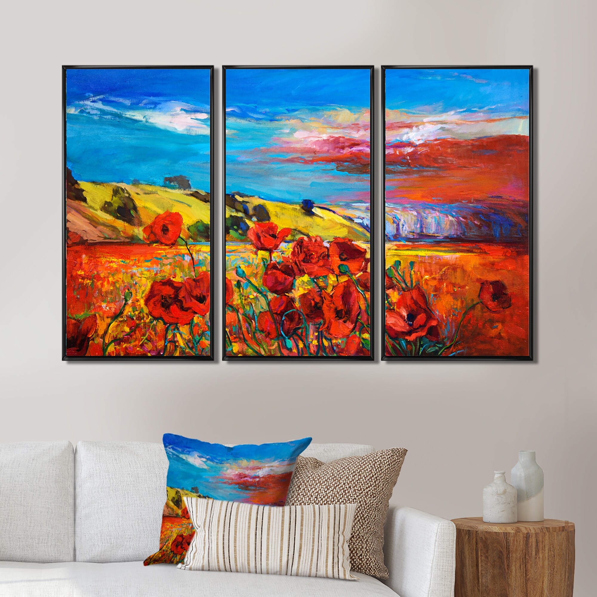 Designart "Blossomg Red Poppy Fieldsunder A Blue Sky" Traditional Framed Art Prints Set of 3 - 4 Colors of Frames