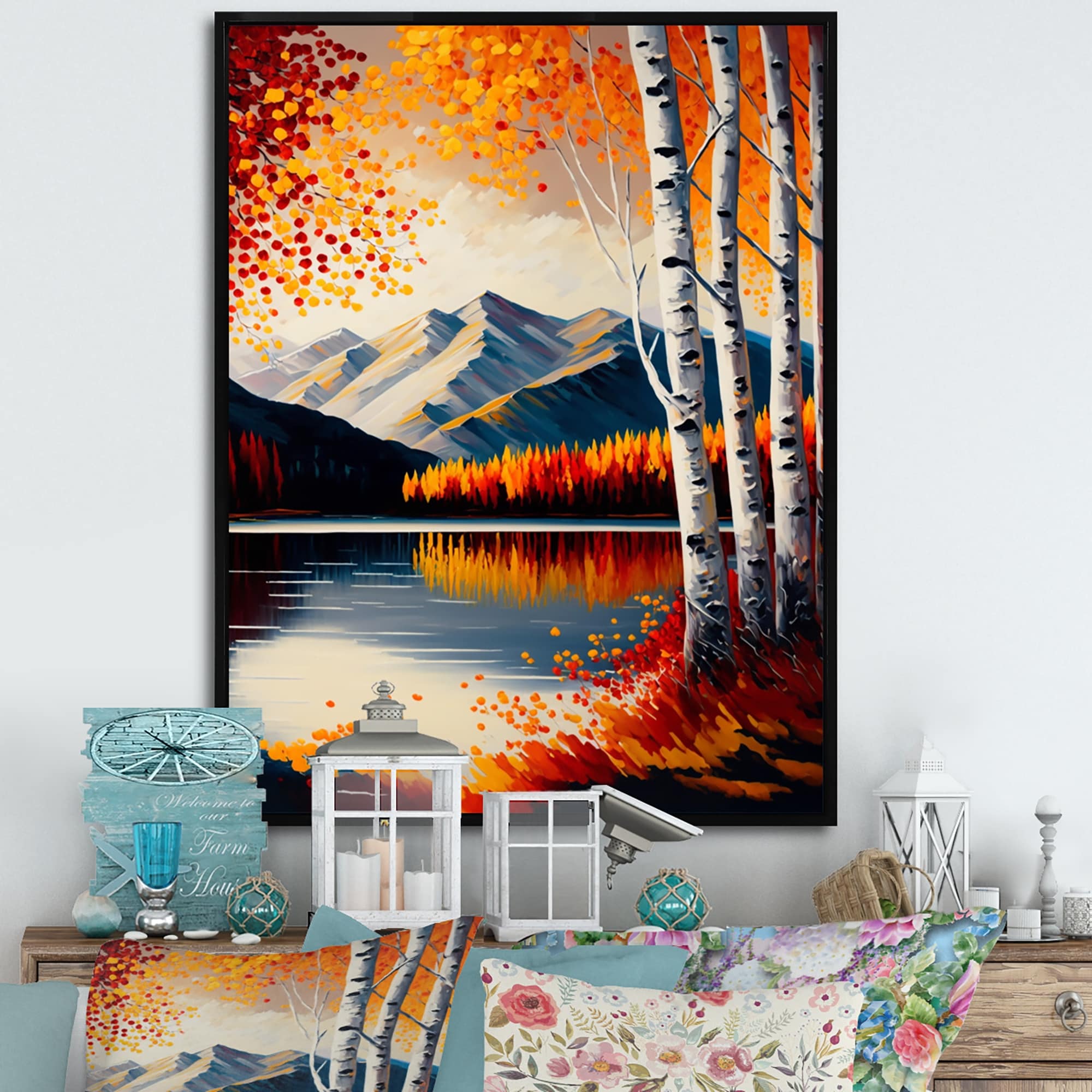Designart "Red And Orange Birch Trees By the Lake V" Landscape Framed Canvas Art Print