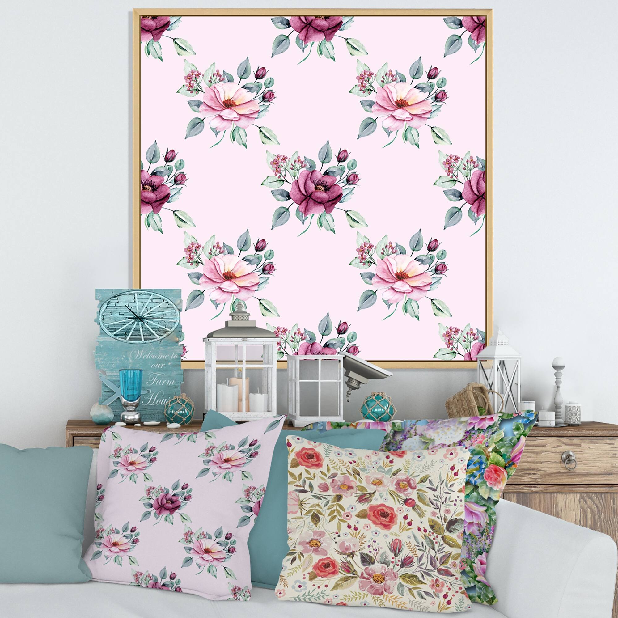 Designart "Pink And Red Spring Flowers on Pink" Patterned Framed Canvas Wall Art Print