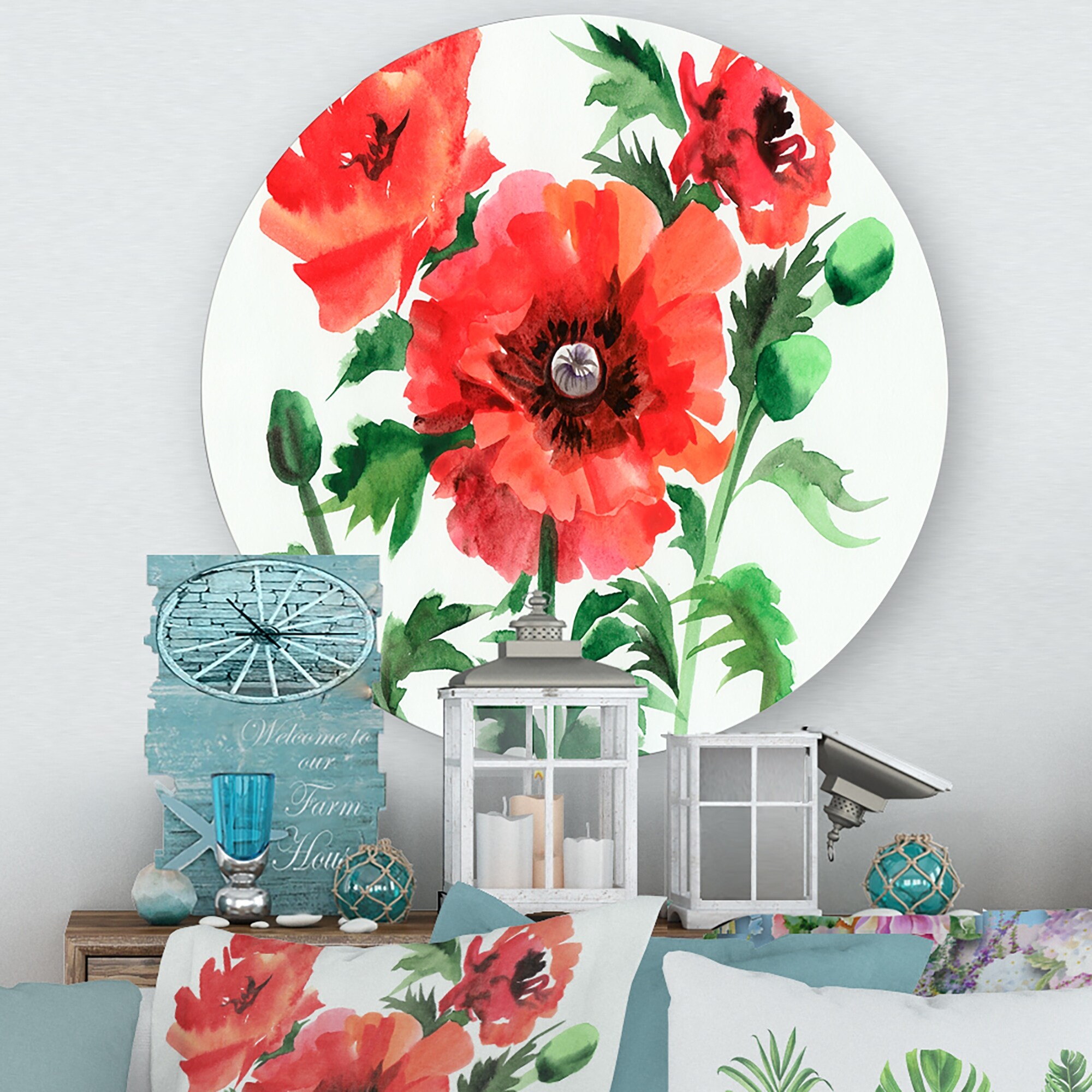 Designart 'Vintage Red Poppies II' Traditional Metal Circle Wall Art