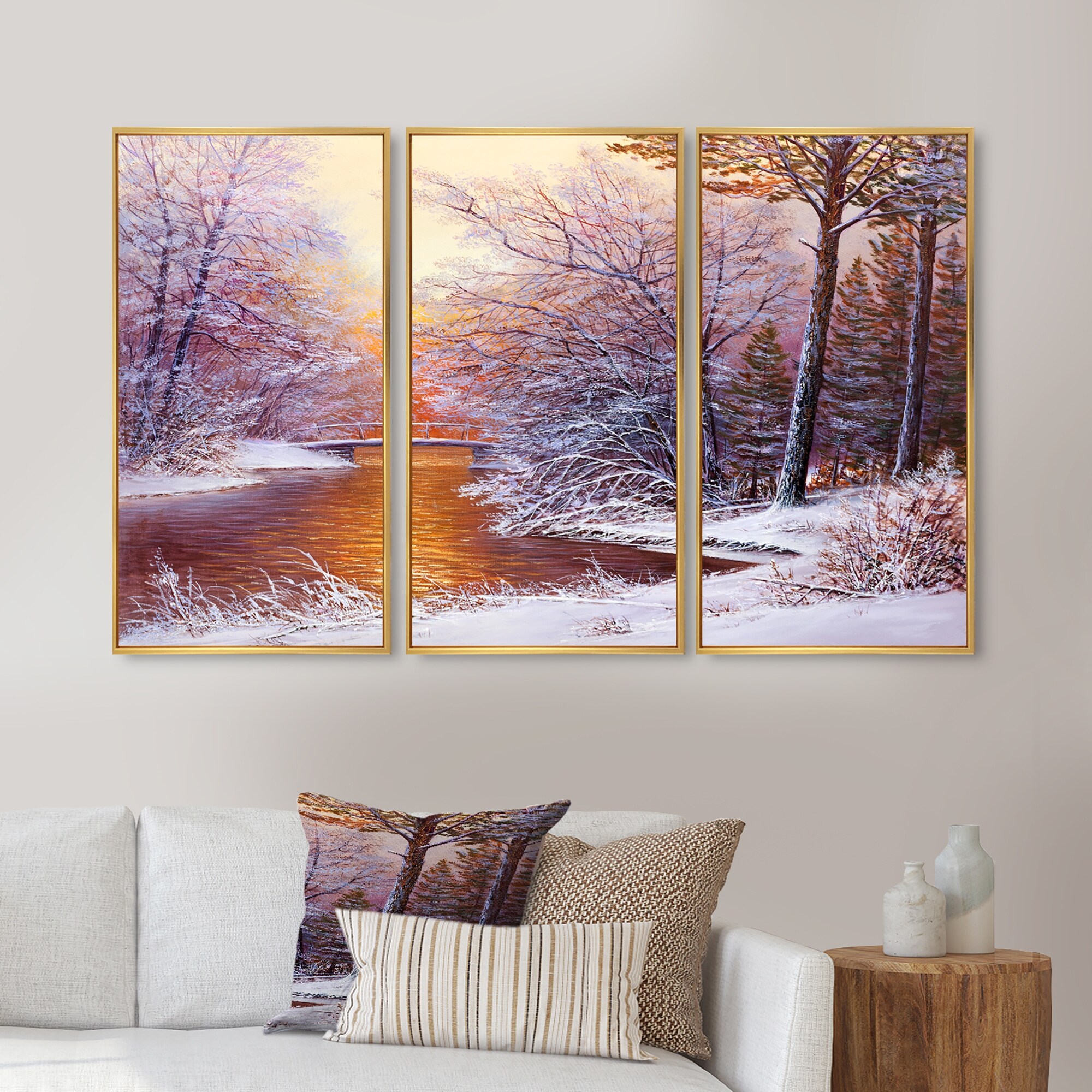Designart "River in Winter Landscape" Landscape Framed Wall Art Set of 3 - 4 Colors of Frames