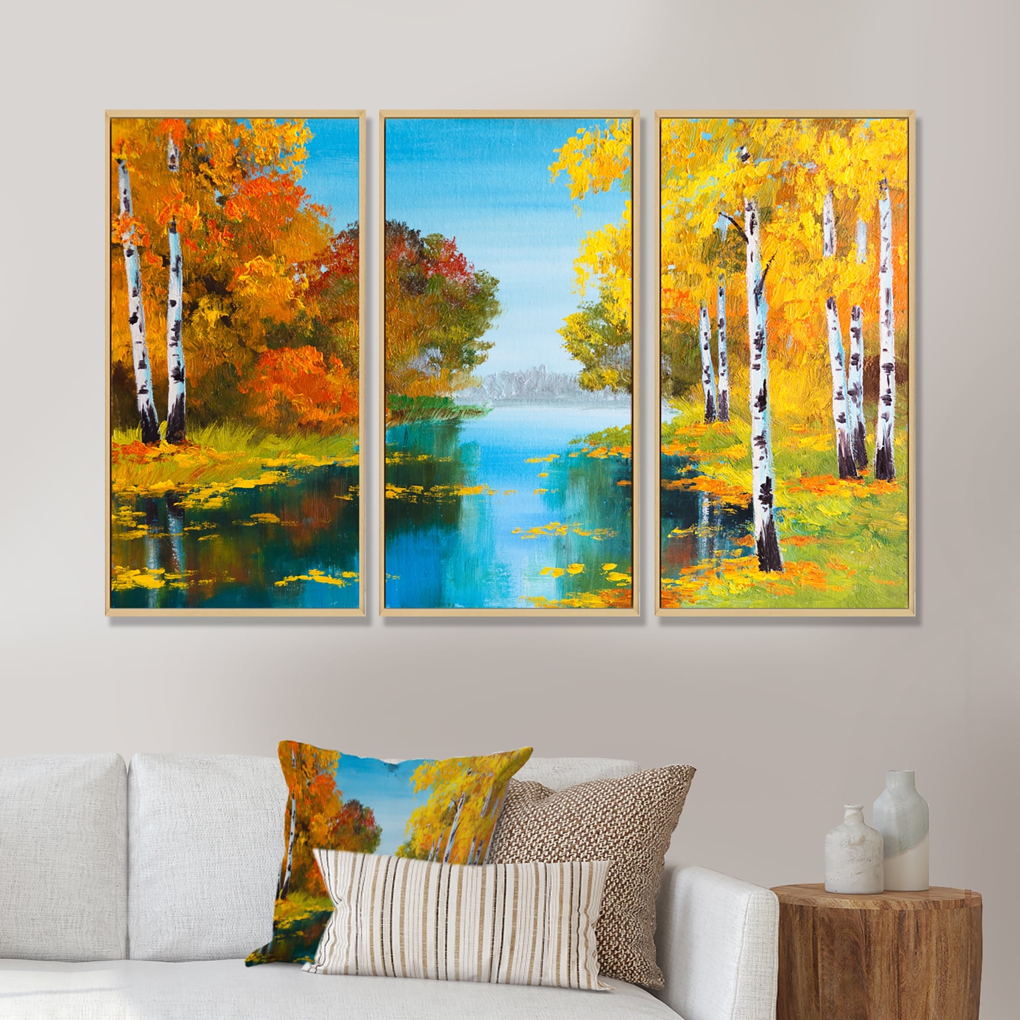Designart "Birch Forest near the River" Landscape Framed Wall Decor Set of 3 - 4 Colors of Frames