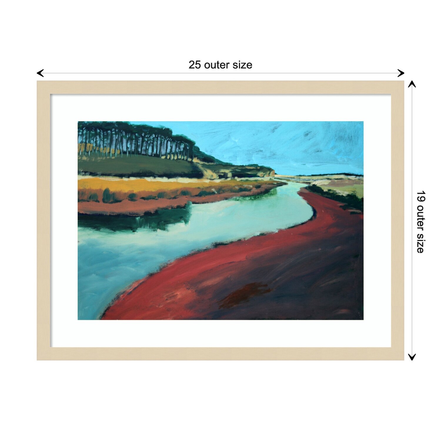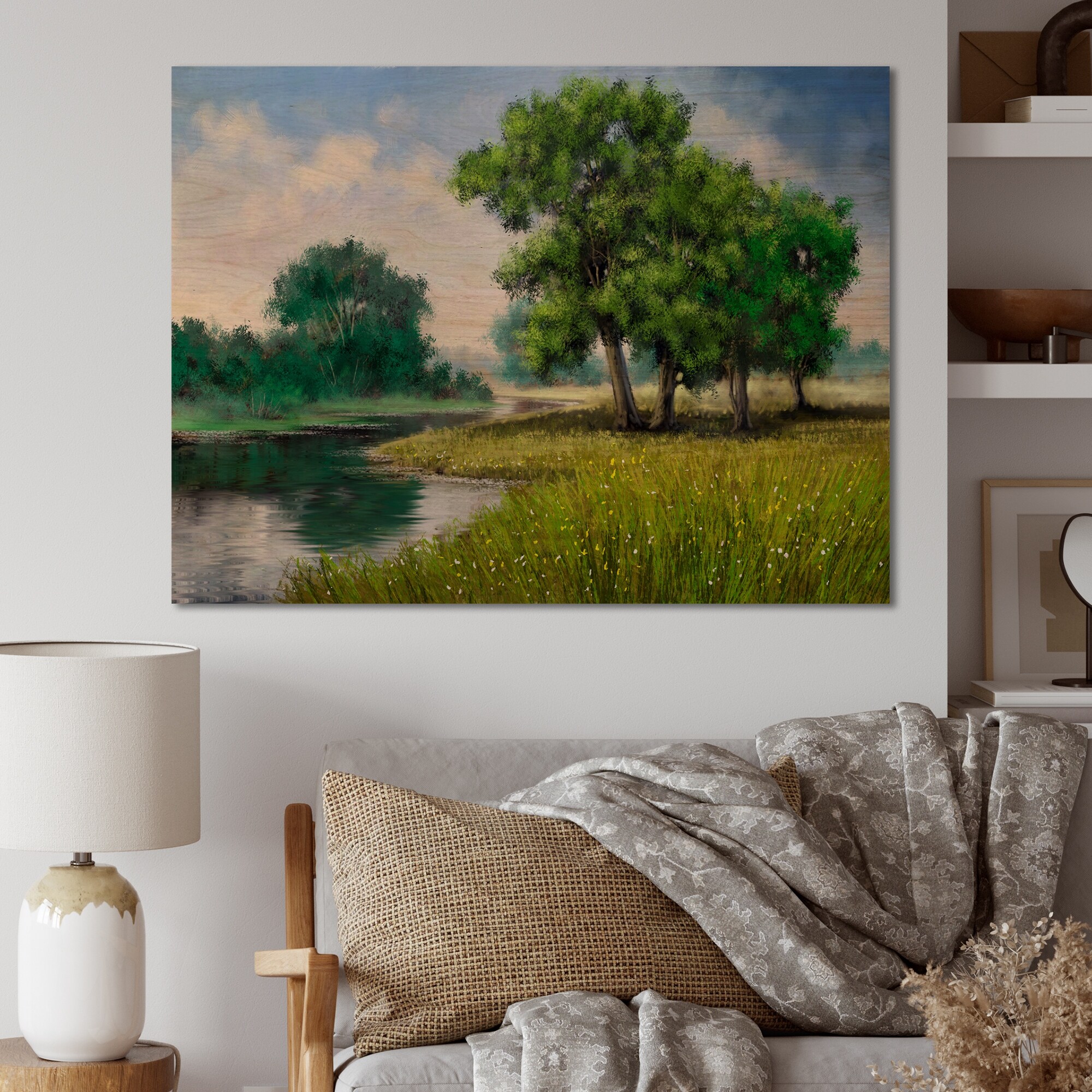 Designart 'Summer River Landscape Illustration' Traditional Wood Wall Art Décor - Natural Pine Wood