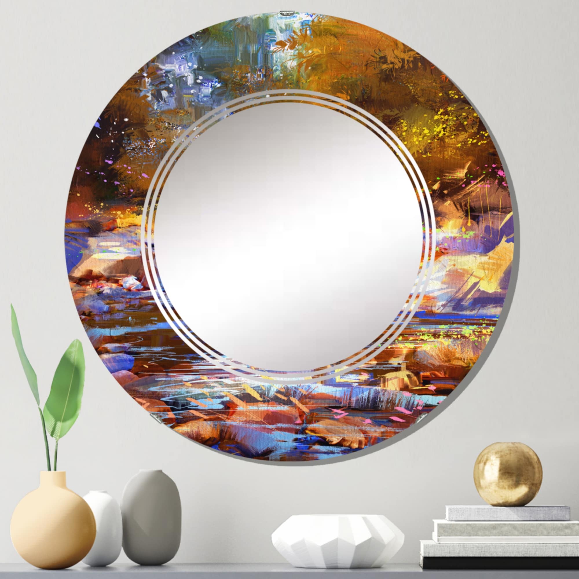 Designart 'Fall River Lines With Colorful Stones in Forest' Printed Traditional Wall Mirror