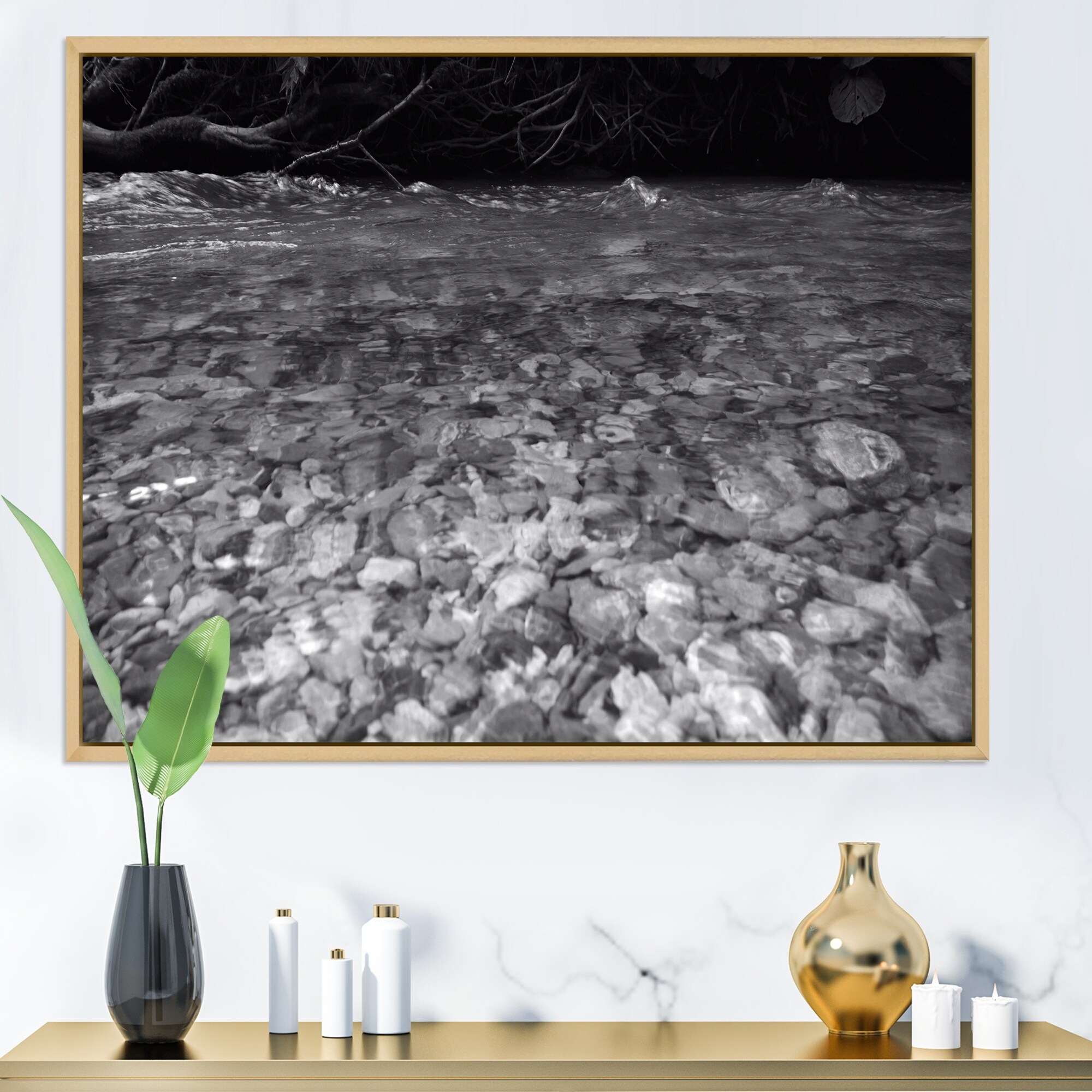 Designart "River And Grey Stones" Traditional Framed Canvas Wall Art Print