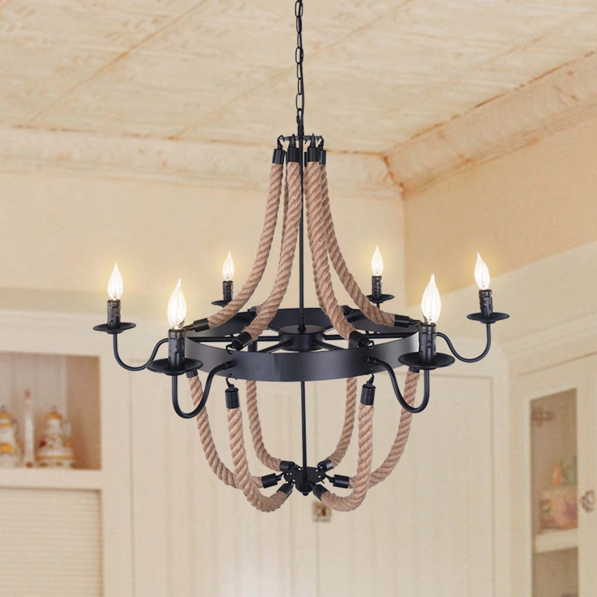 6 - Light Farmhouse Rustic Metal Candle Chandelier with Natural Rope