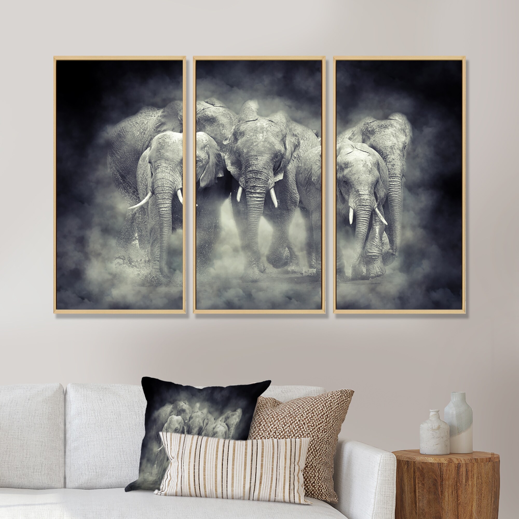 Designart "Kenya National Park Elephant in smoke" Animal Framed Wall Decor Set of 3 - 4 Colors of Frames
