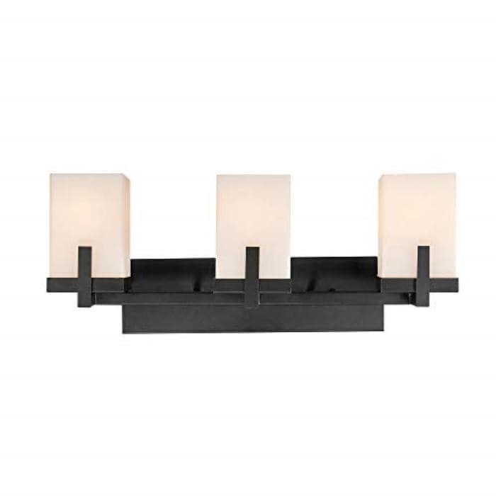 3 light vanity bronze wall sconce with square white off frosted glass shade