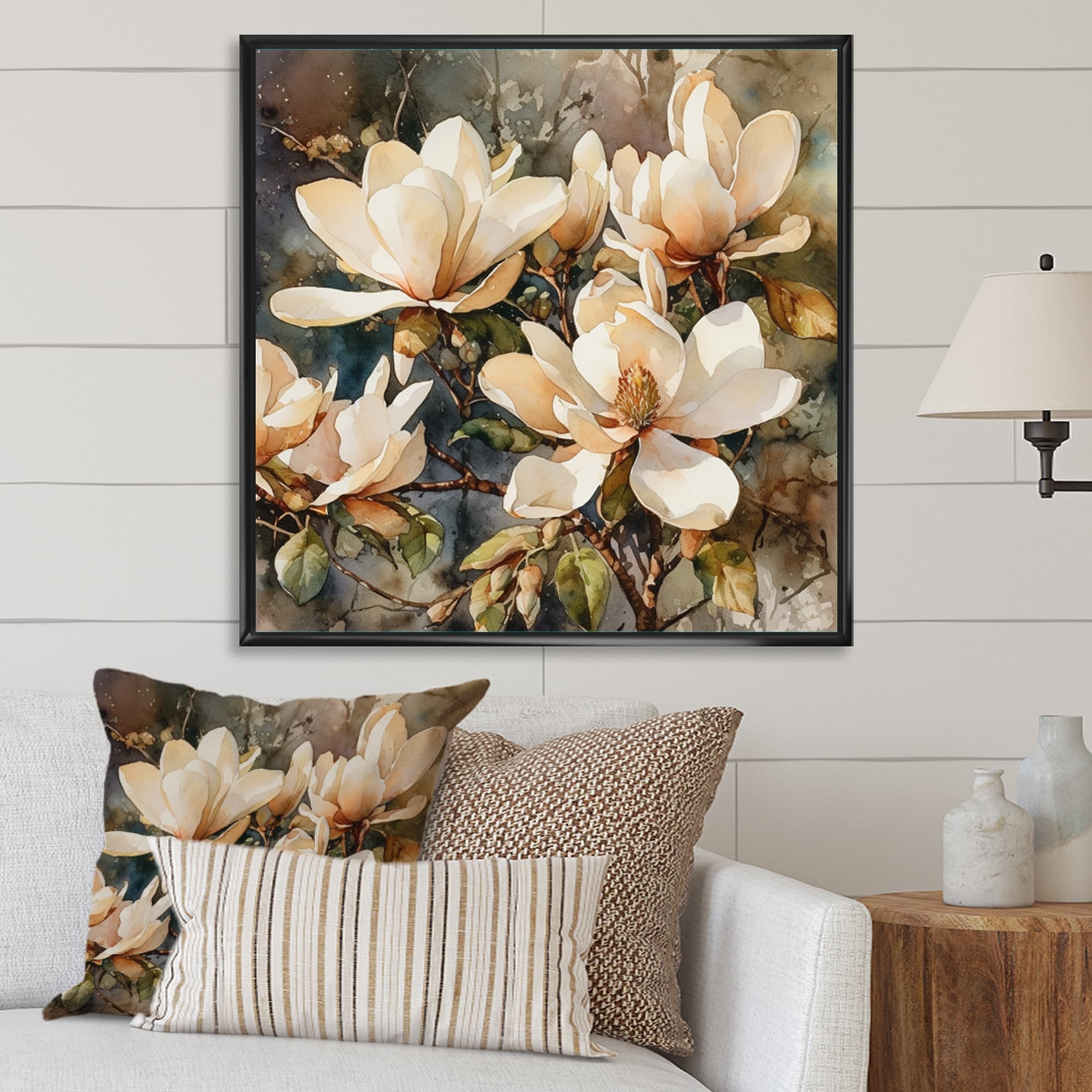 Designart "Cream Magnolia Symphony" Floral Magnolias Framed Wall Decor