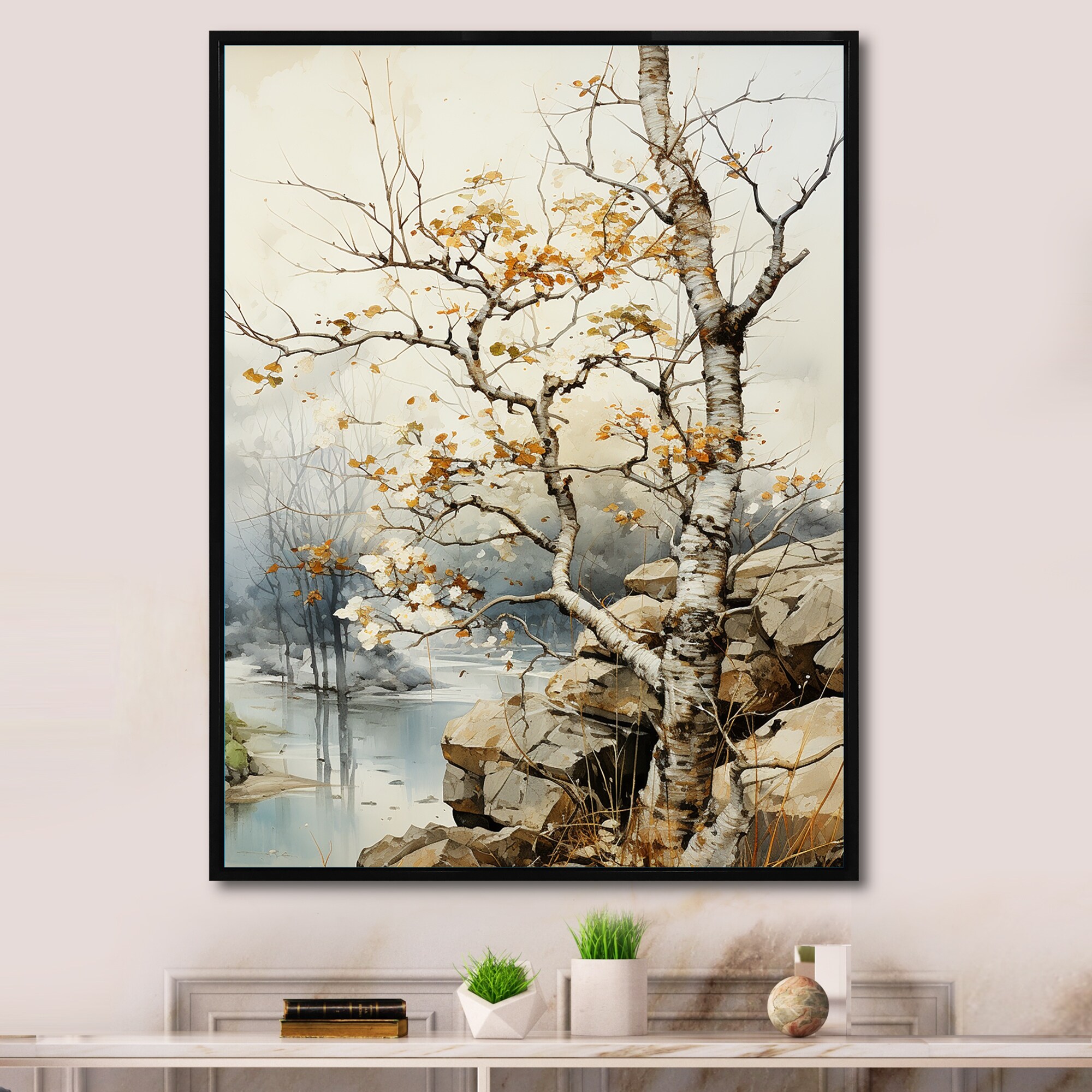 Designart "Beige Grey Tree Sycamore Symphony" Tree Sycamore Framed Canvas Wall Art