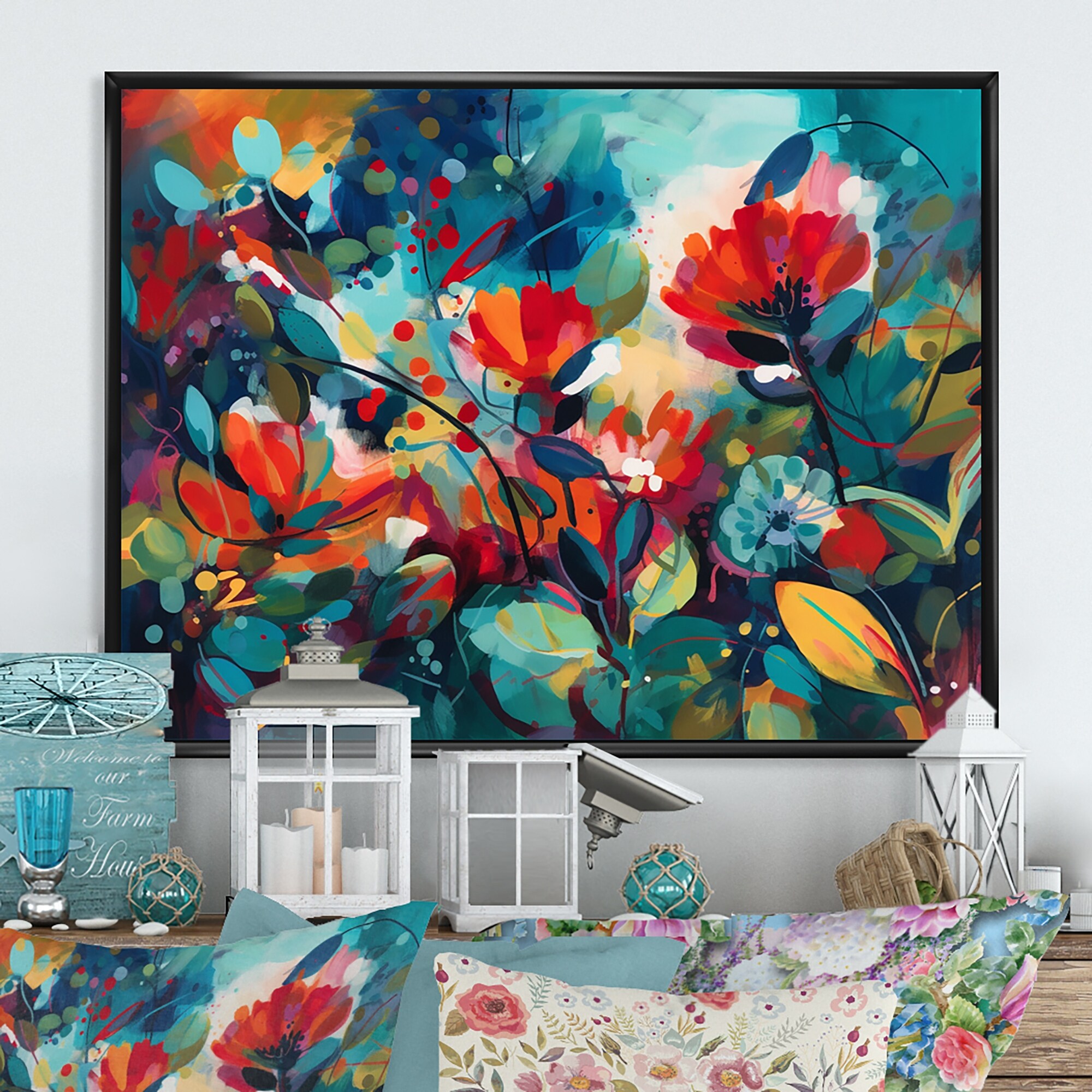 Designart "Red Vibrant Garden Symphony I" Floral Framed Canvas Art Print
