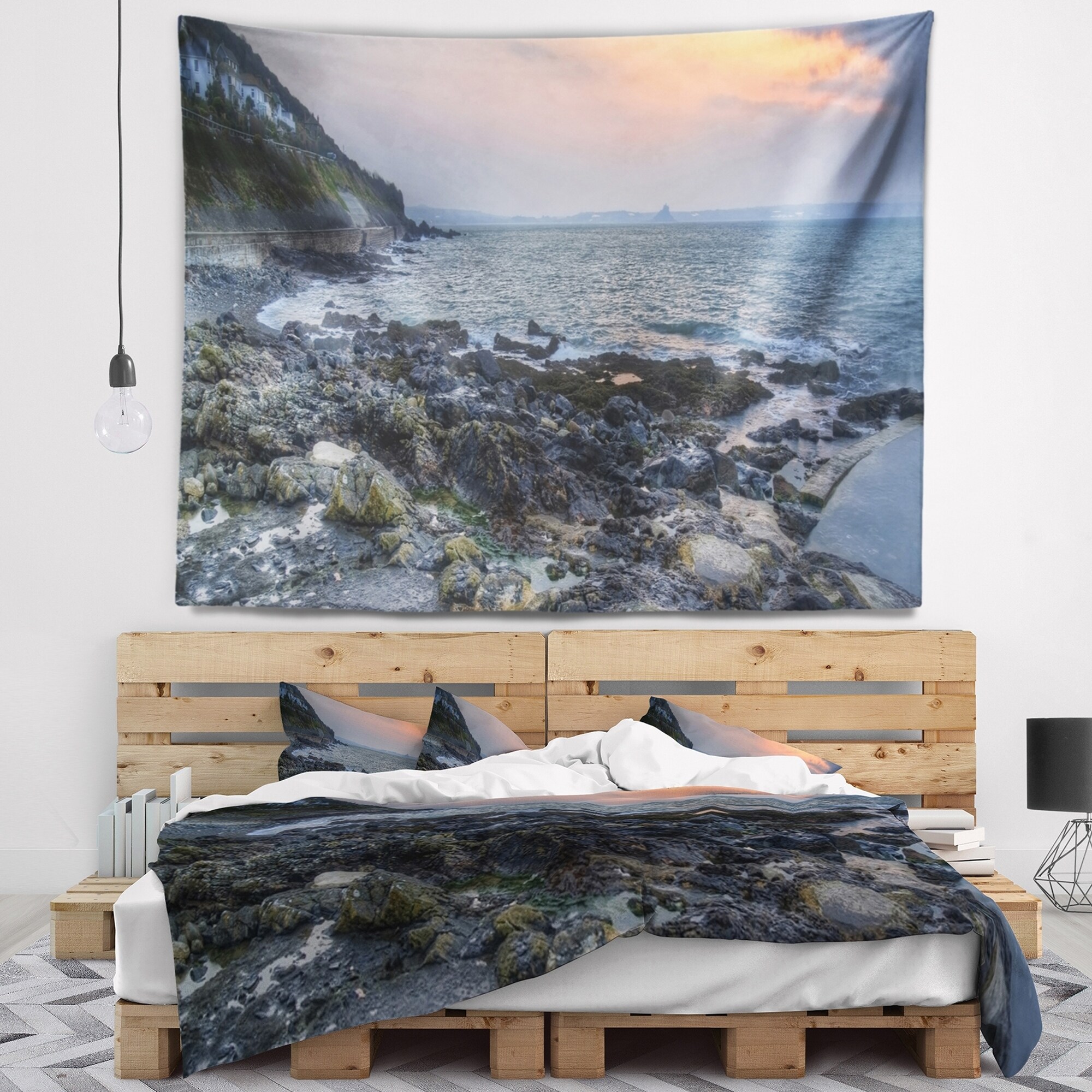 Designart 'Dark Rocky Seashore Sunrise' Seashore Wall Tapestry