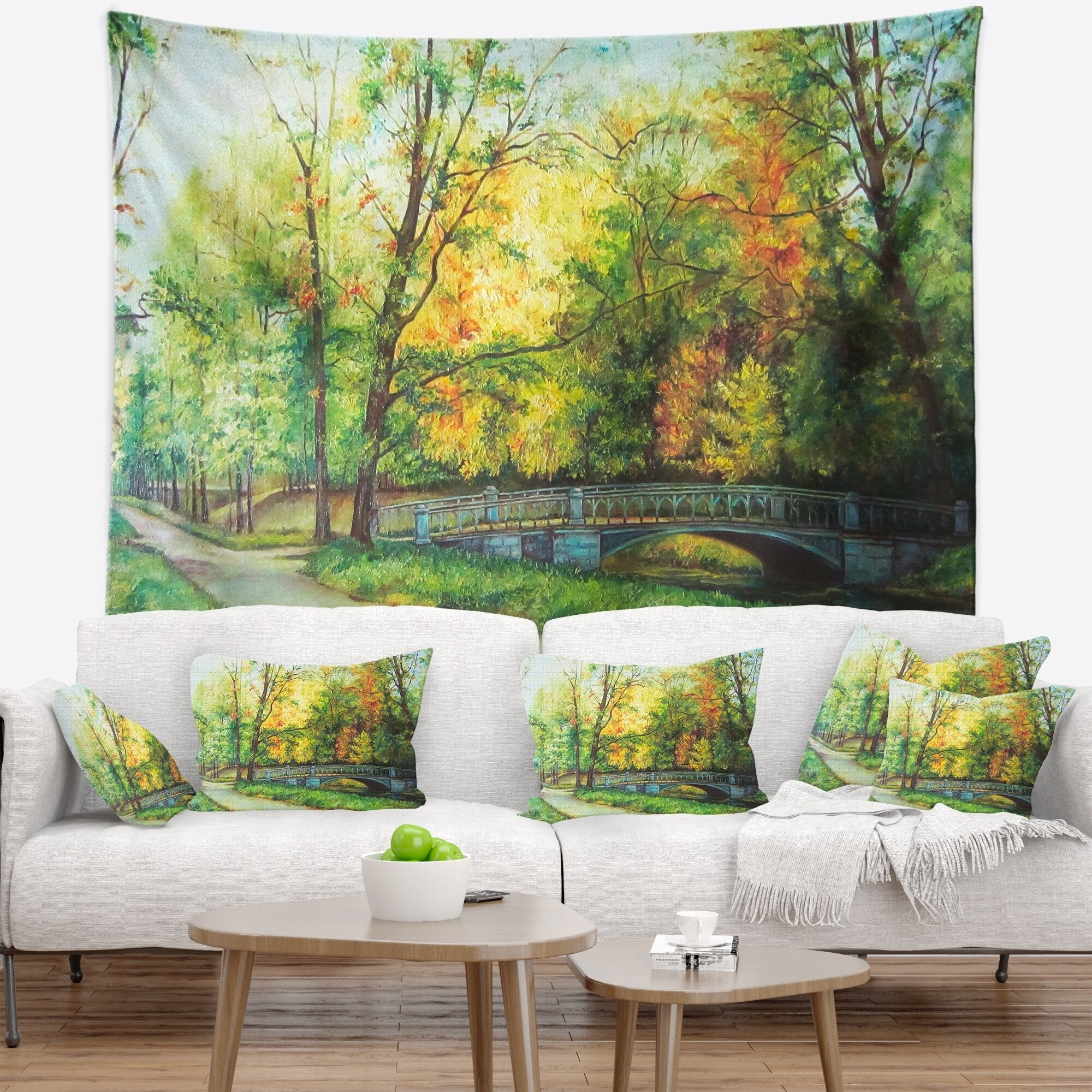 Designart 'Bridge in Colorful Forest' Landscape Painting Wall Tapestry