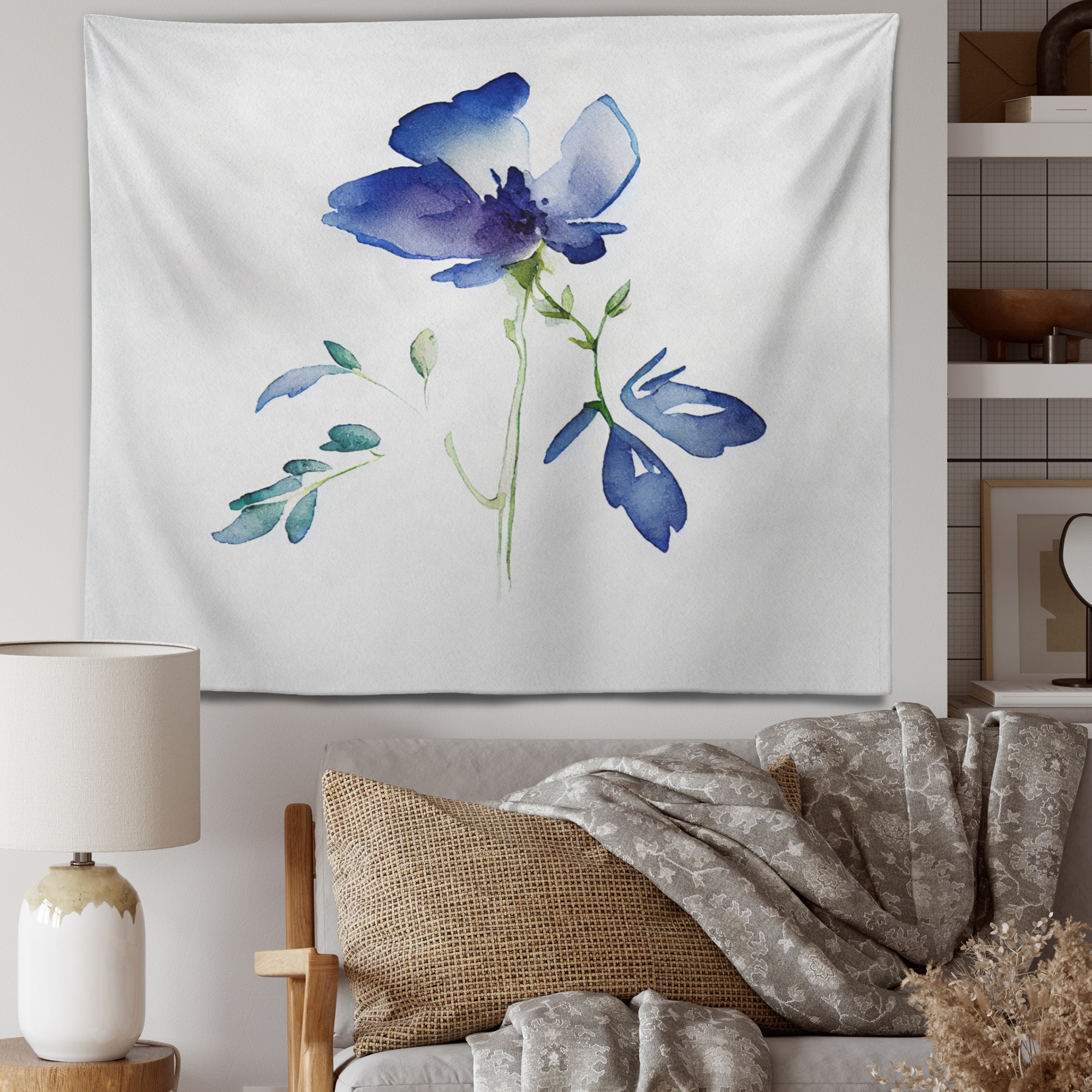 Designart 'Blossoming Blue Retro Flower VI' Floral Wall Tapestry