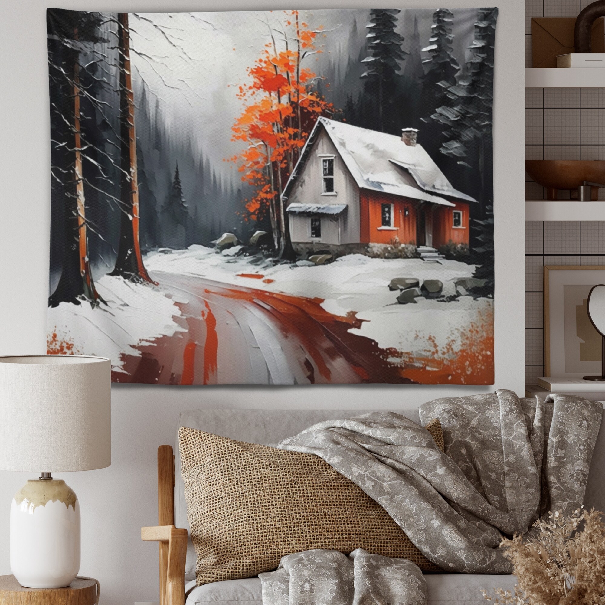Designart 'Monochrome Orange Cottage in Winter IV' Cottage Landscape Wall Tapestry