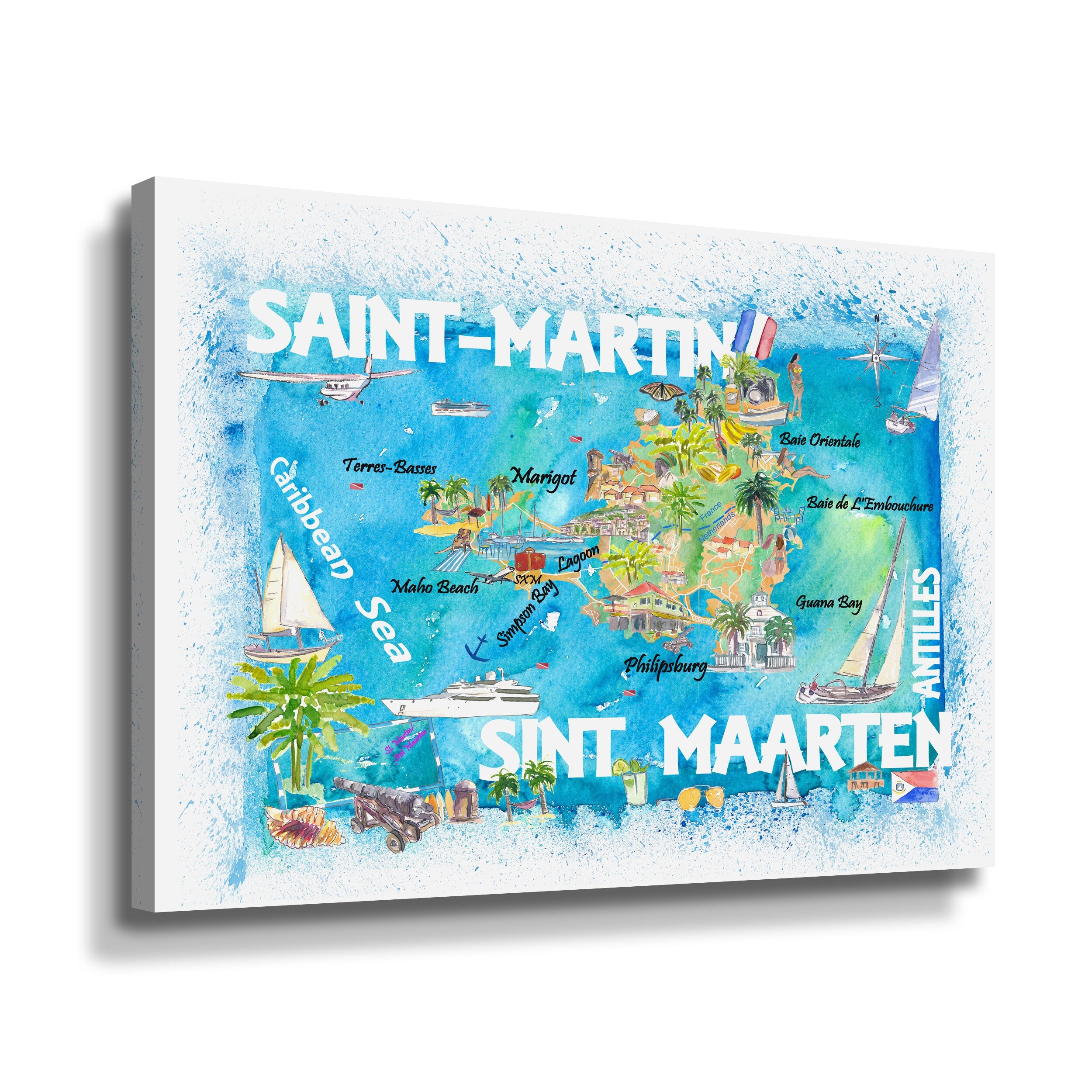 Saint Martin Illustrated Travel Map With Roads Gallery Wrapped Canvas
