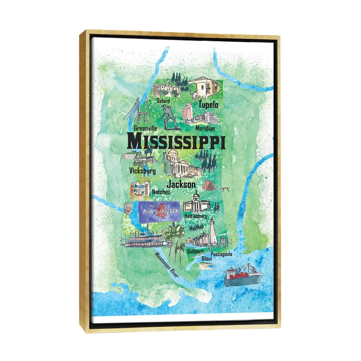 iCanvas "USA, Mississippi Illustrated Travel Poster" by Markus & Martina Bleichner Framed Canvas Print