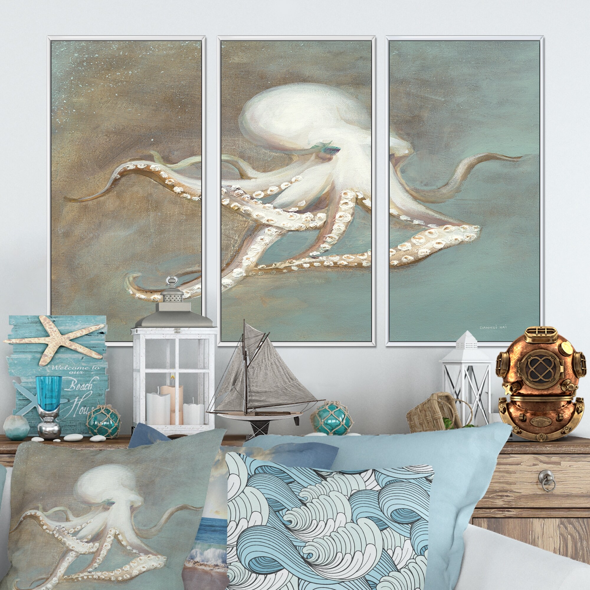 Designart "Octopus Treasures from the Sea" Nautical & Coastal Framed Wall Art Set of 3 - 4 Colors of Frames