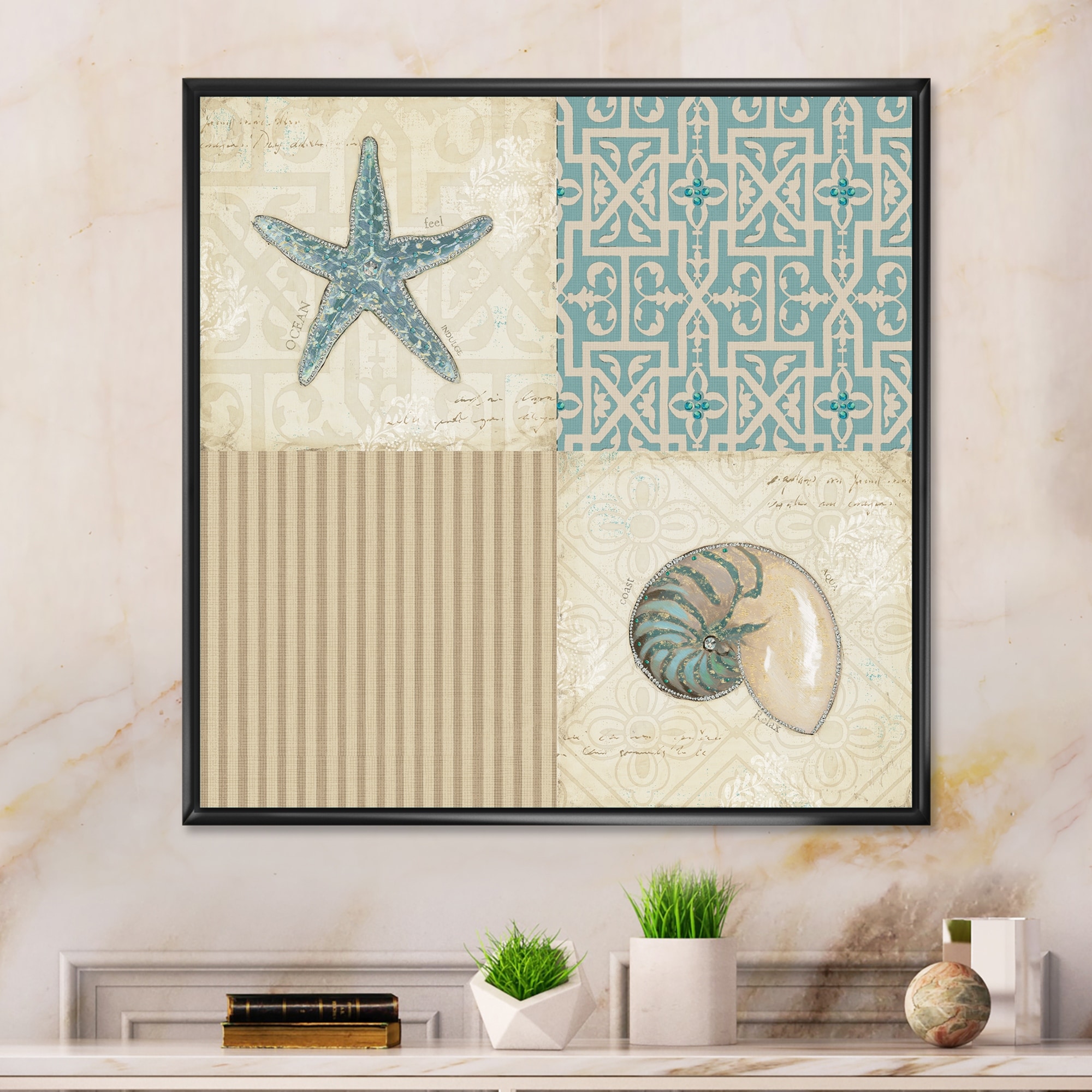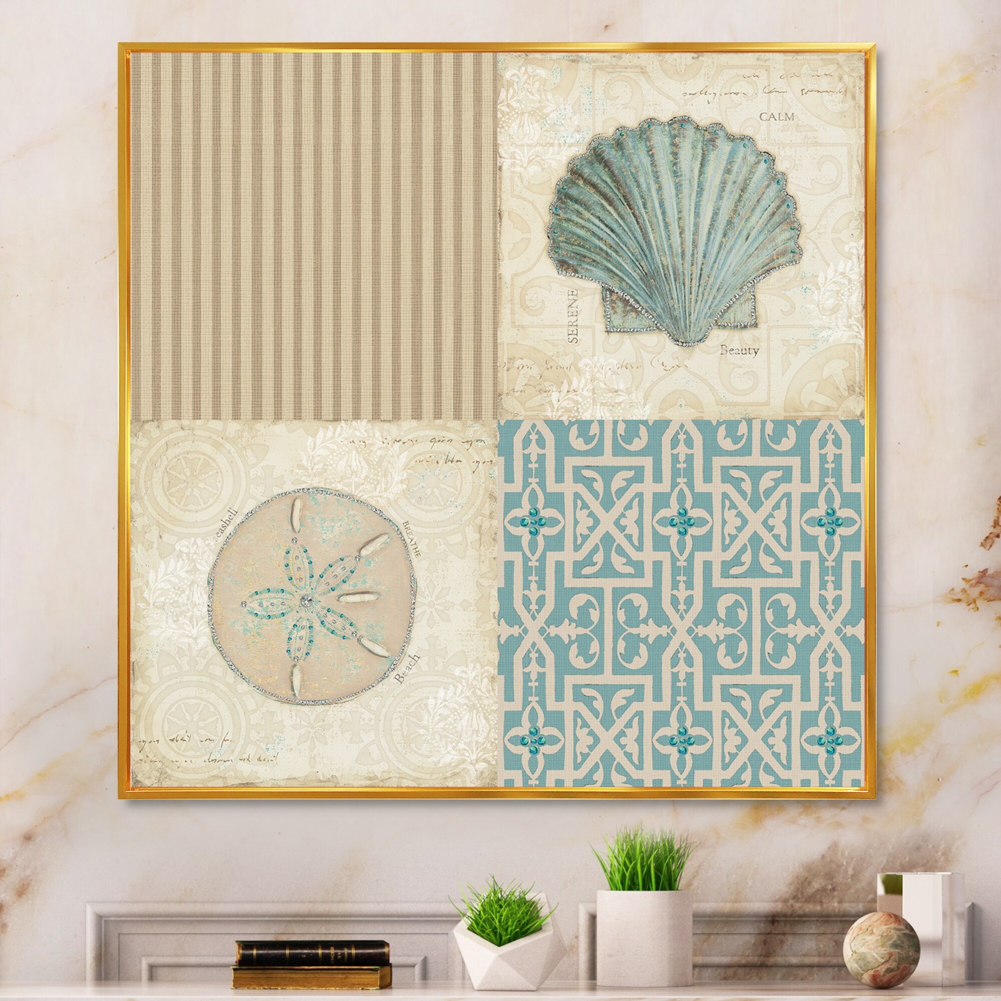Designart "Seaside Seashell Treasures Iv" Modern Landscape Beach Framed Canvas Prints