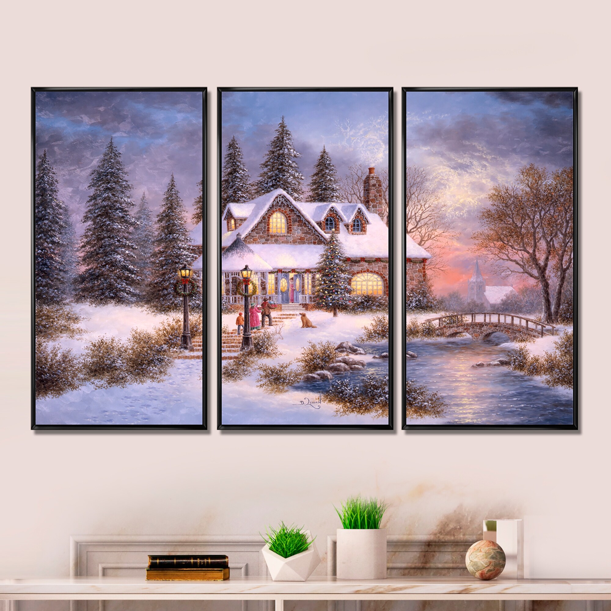 Designart "Winter Christmas Scene A Treasured Time" Traditional Framed Artwork Set of 3 - 4 Colors of Frames