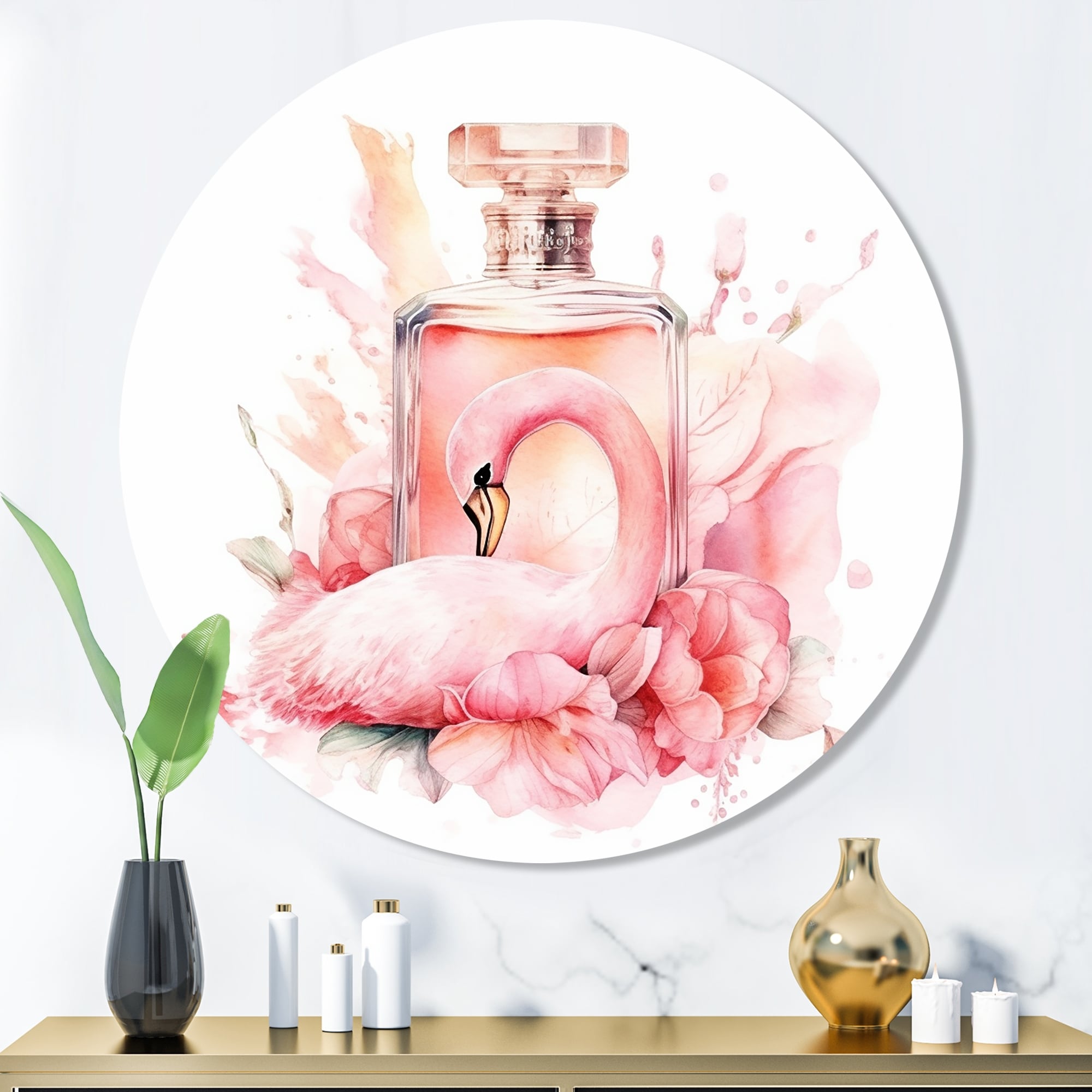 Designart "Pink Perfume Scented Treasures IV" Fashion Perfume Metal Round Wall Art