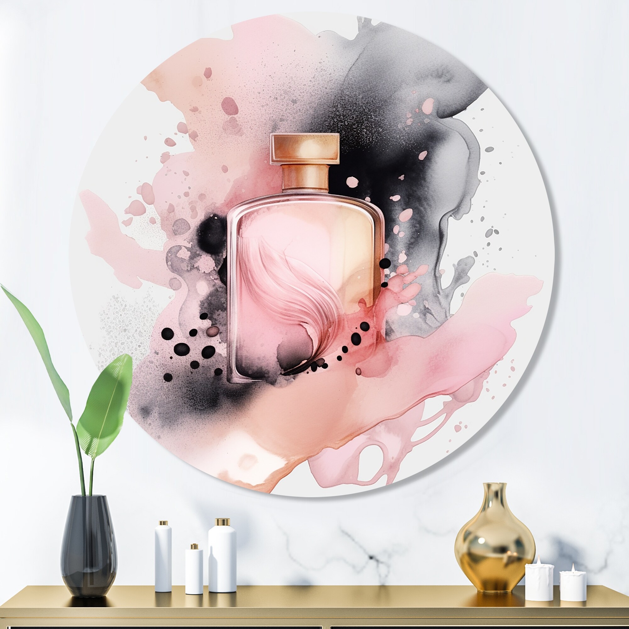 Designart "Pink Perfume Scented Treasures VI" Fashion Perfume Metal Round Wall Art