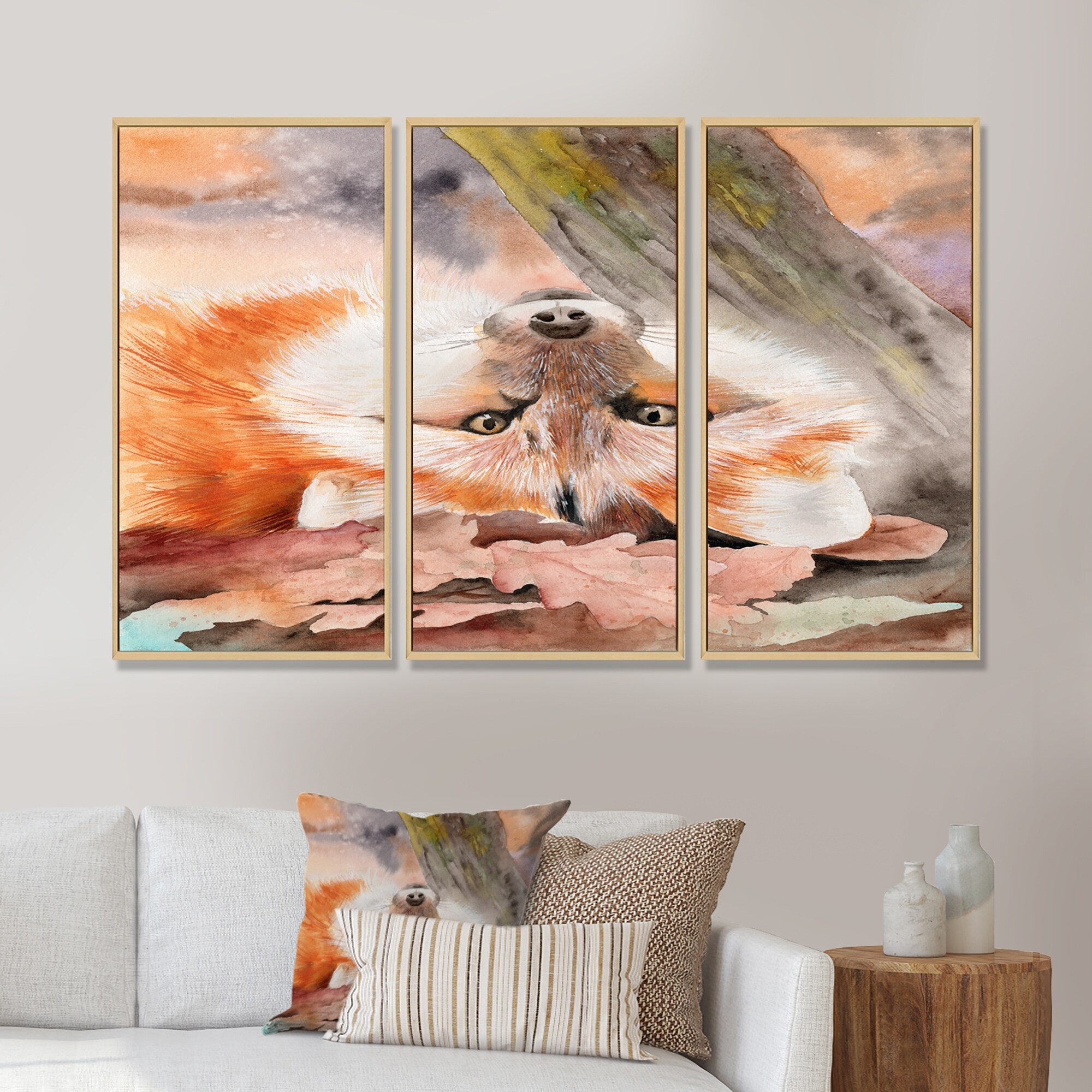 Designart "Red Fox Lying in Fallen Leaves Near A Tree Trunk" Traditional Framed Art Set of 3 - 4 Colors of Frames