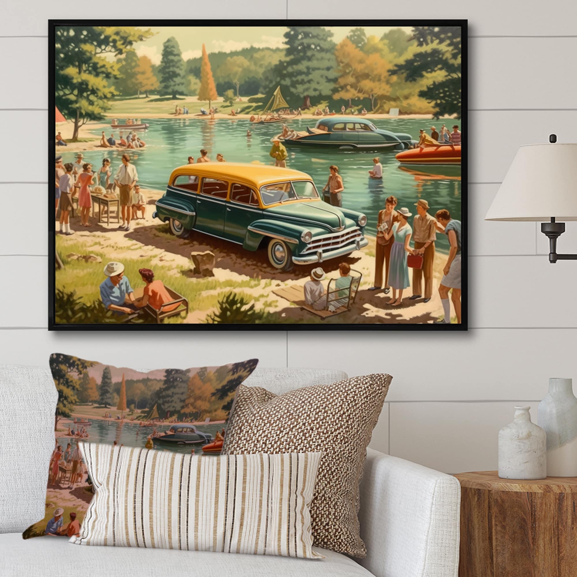 Designart "Flashback To Summer Vacation By the Lake Iv" Cottage Landscape Framed Wall Art for Living Room
