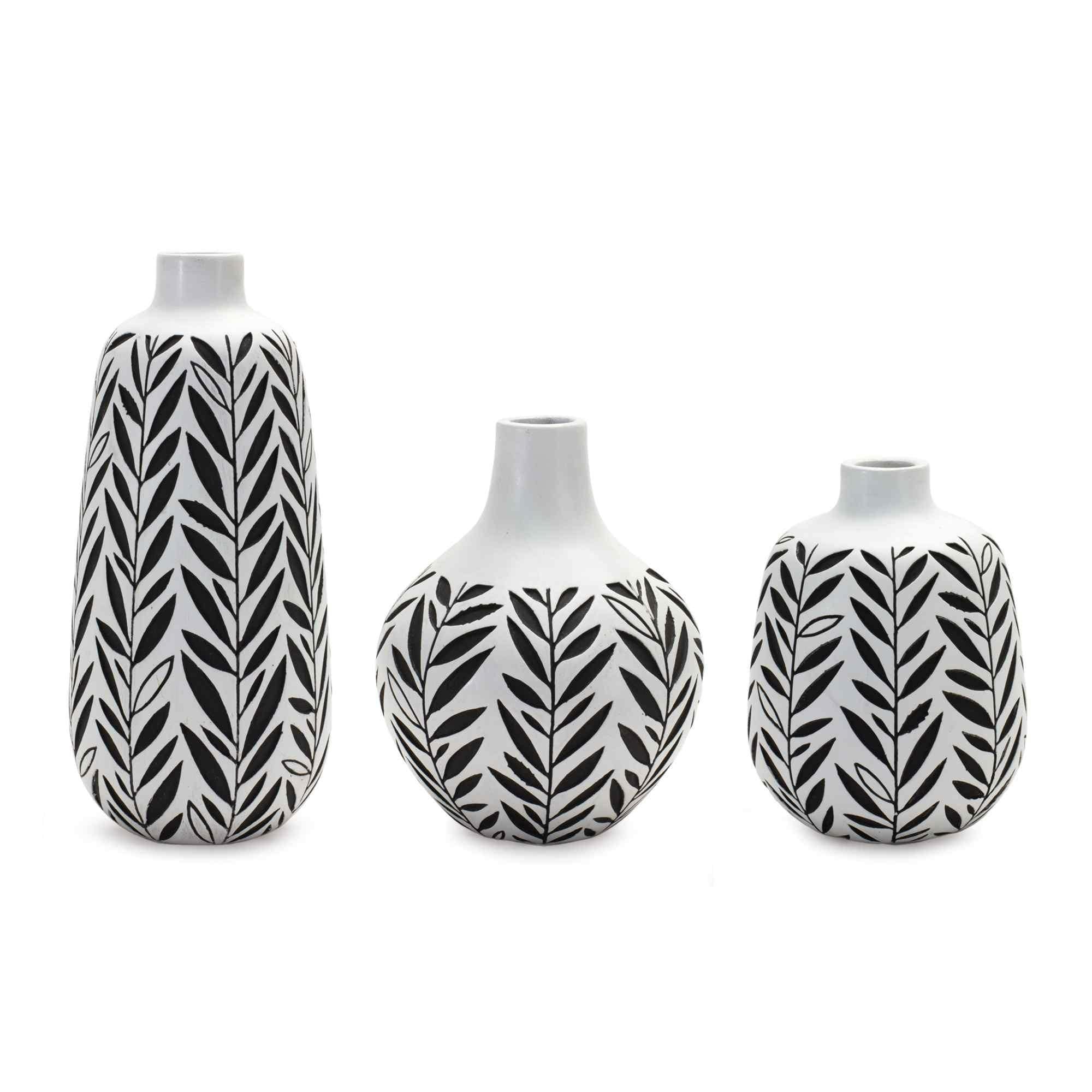 Set of 3 Black and White Leaf Print Bottle Vases 9.25"