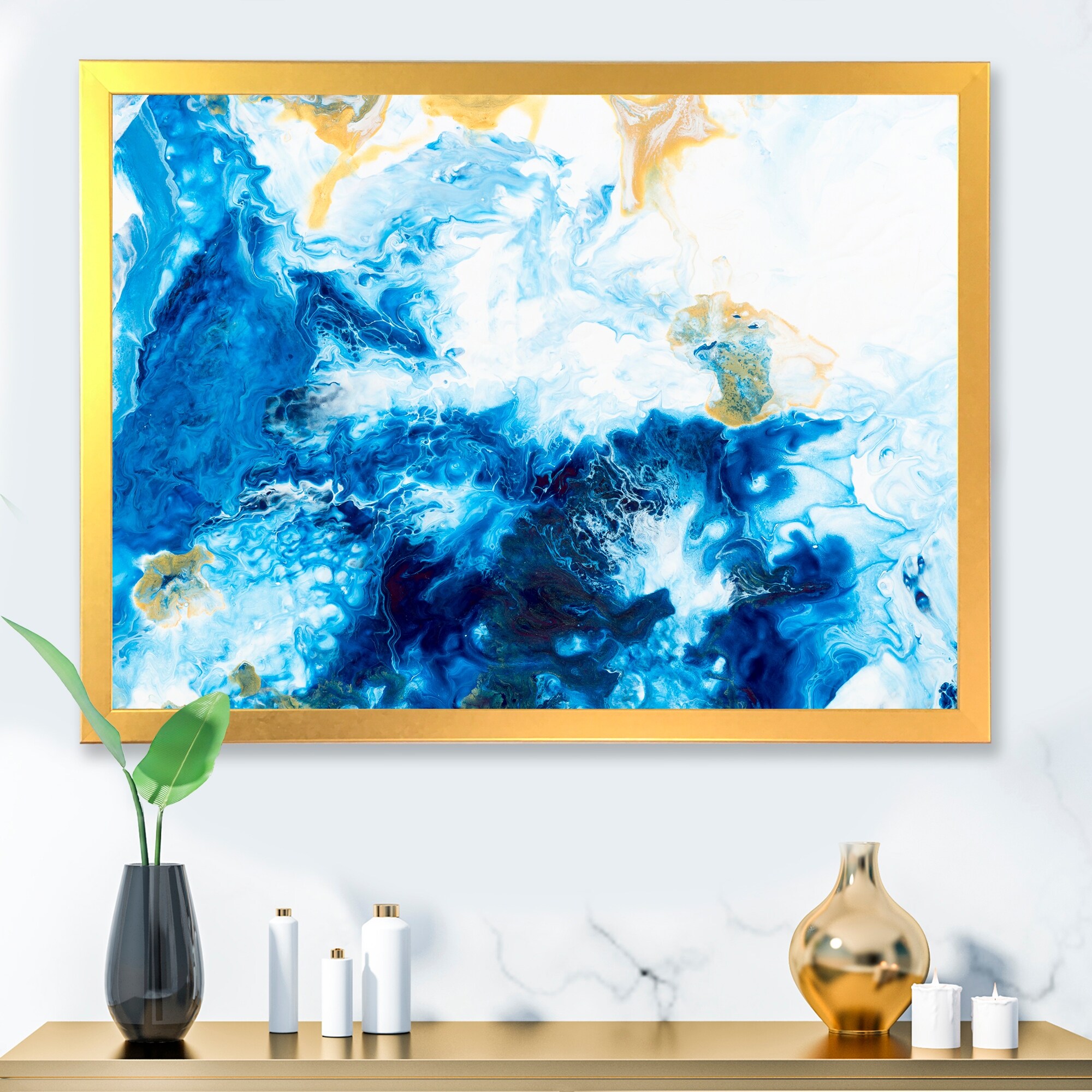 Designart "Blue And White Liquid Art Waves VII" Modern Framed Art Print